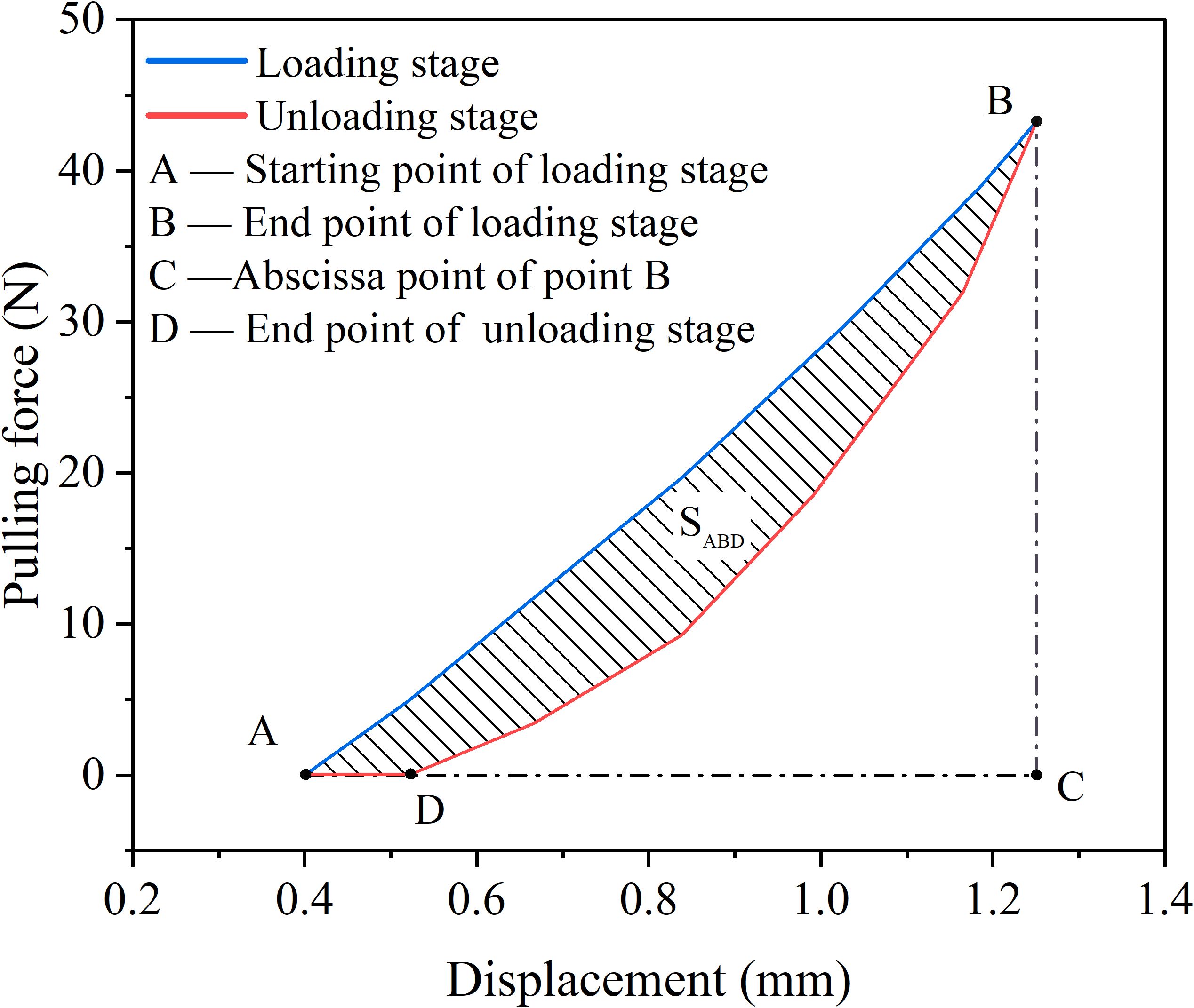 Under cyclic loading, the formation of the hysteresis curve can be further understood from the perspective of energy. The area enclosed by the hysteresis loop represents the energy dissipation within a single loading cycle. This energy primarily reflects the irreversible deformation occurring within the material, along with the associated damage and fatigue accumulation. As shown in Figure 8, during segment AB of the curve, the tensile loading phase, the work done by the external force on the root system corresponds to the area enclosed by curve ABC. Part of this work is stored as elastic potential energy within the root, while the remainder is dissipated through irreversible processes such as plastic deformation and root slippage, transforming into heat or other forms of energy dissipation. In segment BD of the curve, the unloading phase, the tensile force gradually decreases. During root unloading, the area bounded by curve DBC can be used to calculate the released elastic potential energy. Since energy dissipation is unidirectional and irreversible, the unloading curve of the root will always lie below the loading curve during return. The difference between the loading area and the unloading area, SABD, represents the energy dissipated during this loading cycle, ultimately resulting in irreversible residual displacement, i.e., the length of segment AD. The difference in area of this closed region represents the energy dissipated during a single loading and unloading cycle, which is an important indicator of cumulative damage and fatigue in materials during cyclic loading.