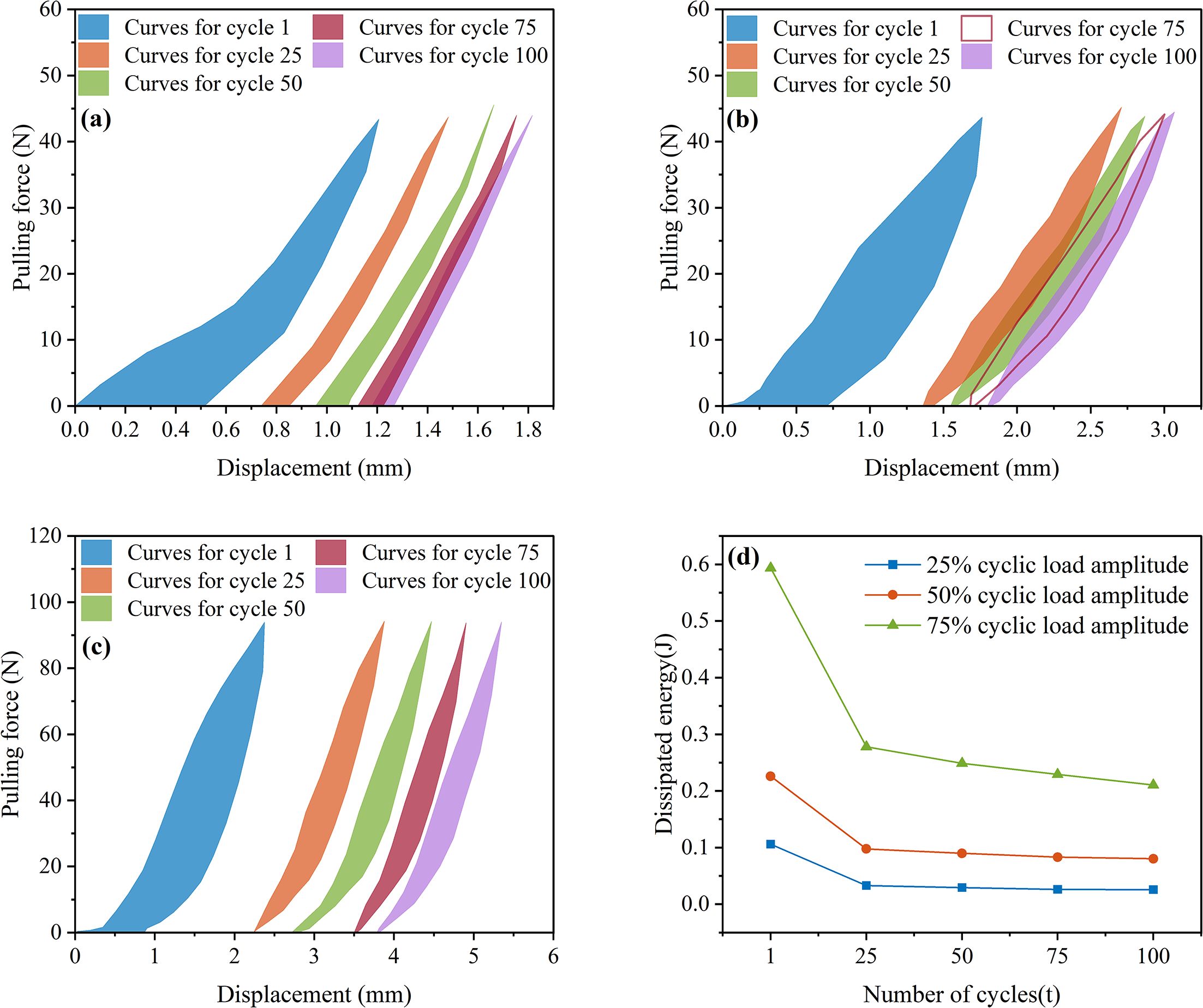 Comparing Figures 5a-c, it can be seen that the peak pullout force decreased after the application of 25%, 50%, and 75% cyclic load amplitudes. After 100 cycles of loading, the average peak pullout forces after the application of 25%, 50%, and 75% cyclic load amplitudes decreased by 23.40 N, 29.88 N, and 39.96 N, respectively. Compared to the peak pullout force before cyclic loading, the decreases were 12%, 17%, and 25%, as shown in Figure 5d. The data above indicate that with increasing load amplitude, the decrease in peak pullout force becomes more substantial, suggesting a greater impact on the anchorage performance of the root system.
