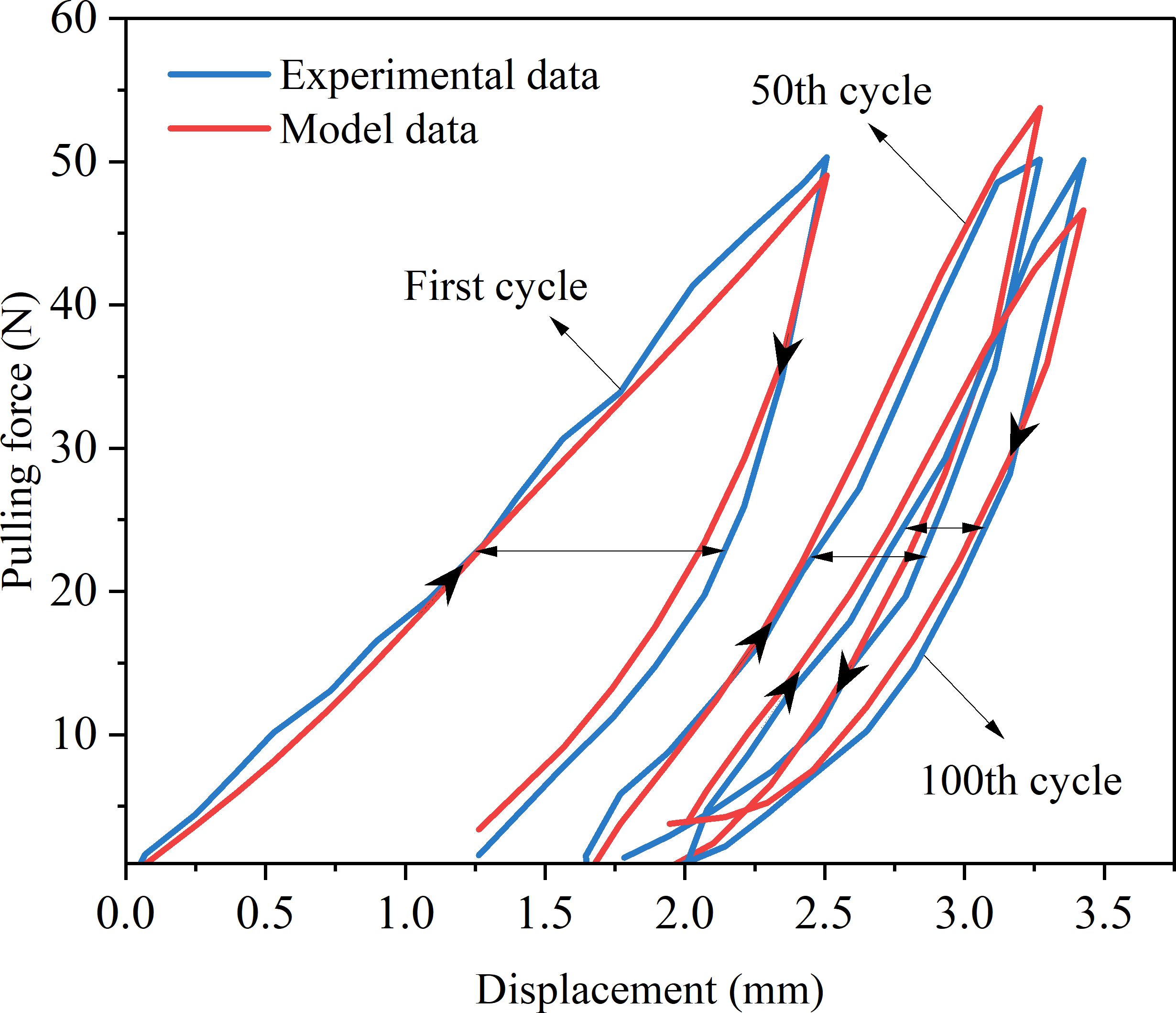 The hysteresis curves determined by the improved BoucWen model and the experimental data values are shown in Figure 10. In Figures 10a-c, the root systems were not pulled out after undergoing 100 cycles of loading. However, in Figure 10d, the root system was pulled out before reaching 100 cycles under 75% cyclic loading. Nevertheless, the improved Bouc-Wen model was still able to accurately fit the hysteresis behavior of the root systems described above. The results indicate that the improved root-soil cyclic load model, based on the Bouc-Wen model, shows a high degree of agreement with the experimental data. It captures the main characteristics of the hysteresis curve and effectively describes the hysteresis behavior of roots under cyclic loads.