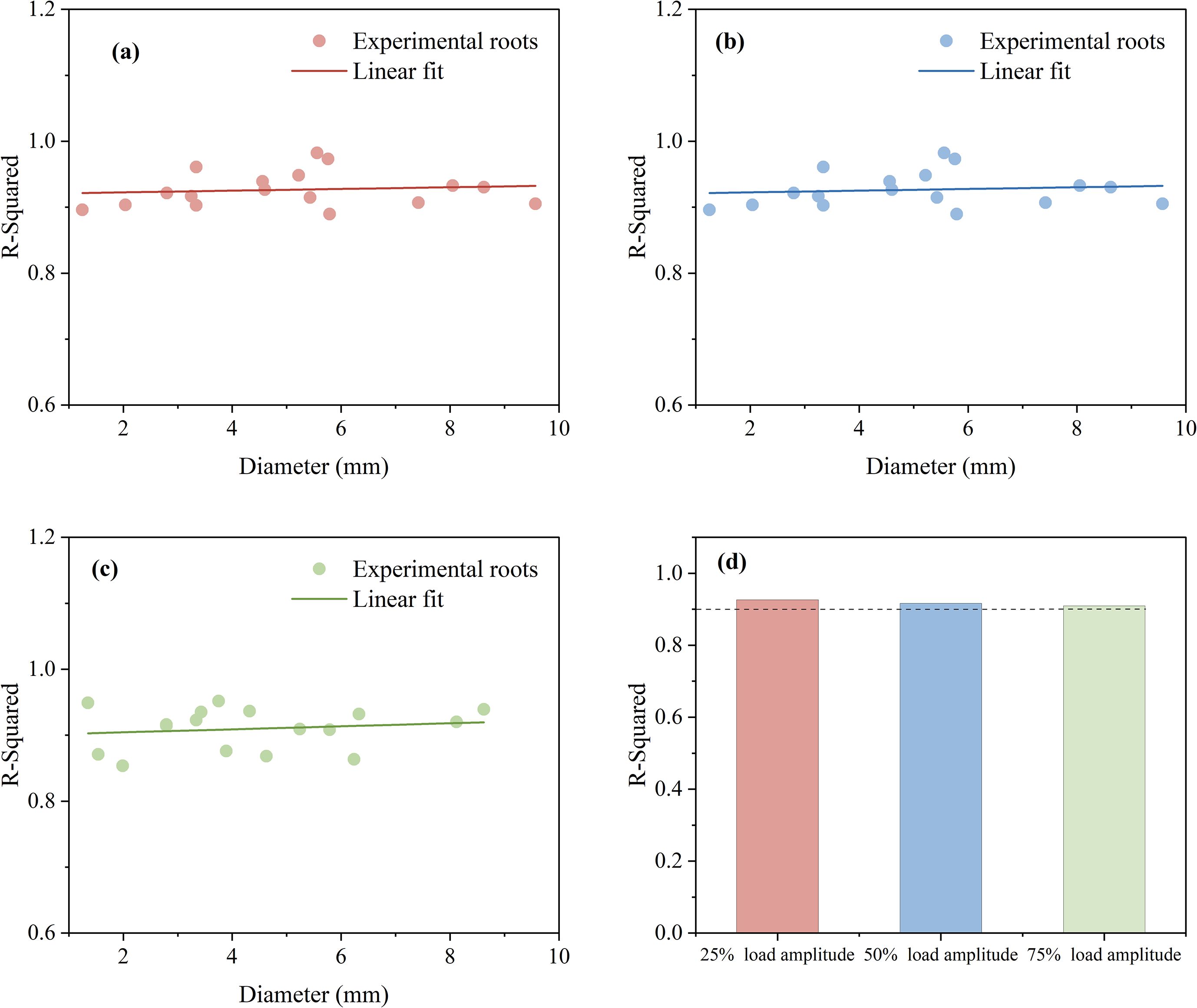 Perform regression analysis on the curves in Figures 5a-c, as shown in Table 5. By comparing the regression equations of root peak bearing capacity and root diameter before and after cyclic loading, it can be seen that R2 gradually decreases, indicating that the correlation between peak bearing capacity and root diameter weakens after cyclic loading. By searching other literature, we found that the bearing capacity and root diameter also have the form of a power function (Zhang et al., 2020; Fan et al., 2025), but by comparison, it was found that the bearing capacity and root diameter are both positively correlated. Regarding the different fitting functions, this may be due to the influence of factors such as soil and root type. Therefore, based on the above results, we can draw a rigorous conclusion that the bearing capacity and root diameter are positively correlated, but the specific linear relationship may not apply to other experimental conditions.