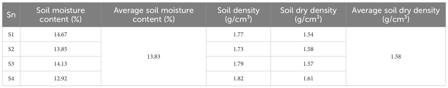 In accordance with the experimental protocol, a soil sample was prepared with a controlled moisture content of 13.83%. The soil was introduced into the specimen box in five successive layers, following the principle of incremental filling to enhance compaction uniformity. Each layer was compacted using a 4 kg iron hammer and scarified to ensure effective interlayer bonding. During the filling of the third soil layer, a section of soil was initially added, after which the root system was carefully embedded, ensuring its central alignment within the soil matrix. The filling process was then resumed, and the soil was compacted to maintain structural integrity. The root system was buried to a depth of 15 cm and divided into three equal segments for analysis. The diameter of each segment of the root system was measured, and the average diameter was calculated. Root systems exhibiting a diameter variation exceeding 0.5 mm across the three segments were discarded and replaced to ensure uniformity. A 15 cm length of the root system was left exposed outside the specimen box. Of this, 10 cm was allocated for clamping and securing the roots, while the remaining 5 cm served as the free end length, ensuring consistent experimental conditions. The root sampling statistics are shown in Table 2.