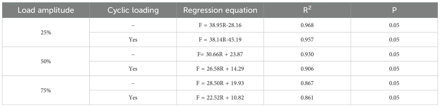 Table 5. Regression equations for peak loads and diameters under different load amplitudes before and after cyclic loading.
