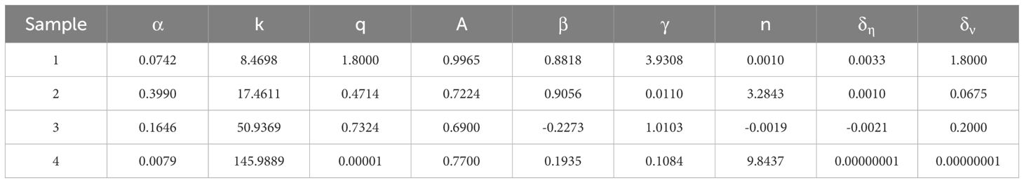 Based on loading data obtained under three different cyclic load amplitudes of 25%, 50%, and 75%, a total of 54 specimens were used to identify the parameters of the improved Bouc-Wen model through the application of an optimization algorithm. Due to the large volume of data, this table presents four representative cases under three amplitude conditions. The parameter identification values for each case are shown in Table 6, while the remaining samples are used to evaluate the model’s accuracy. By statistically analyzing 54 root samples to identify the parameters of the improved Bouc-Wen shape parameter q, we concluded that the parameter identification range of q is 0-2. As the number of iterations increases, the range of q gradually decreases, ultimately yielding an accurate q value.