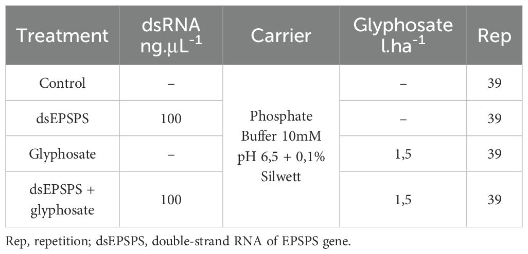 Applications were performed early in the morning, using an airbrush calibrated at 15 PSI (1 bar) pressure. Approximately 3mL of the solution, containing the phosphate buffer and the Silwett adjuvant, was applied per treatment. In the specific treatments, dsRNA targeting the EPSPS gene was incorporated at a concentration of 100ng·μL−1 (Table 1). Following application, plants remained unirrigated for 24 hours.