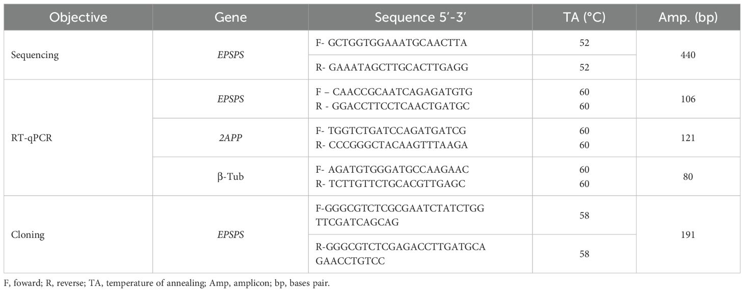 Despite the agronomic relevance of D. insularis, genomic and transcriptomic data for this species are still scarce in public databases (Montgomery et al., 2024). Choosing conserved regions of the EPSPS gene from multiple alignments among species of the same family represents an effective strategy for gene prospecting, especially for those involved in essential metabolic pathways whose functional integrity is critical, such as EPSPS in the shikimate pathway. Studies such as those by Rafique et al. (2023) show that the use of orthologous sequences permits the identification of ideal segments for primer design and the selection of dsRNA target regions with good specificity.