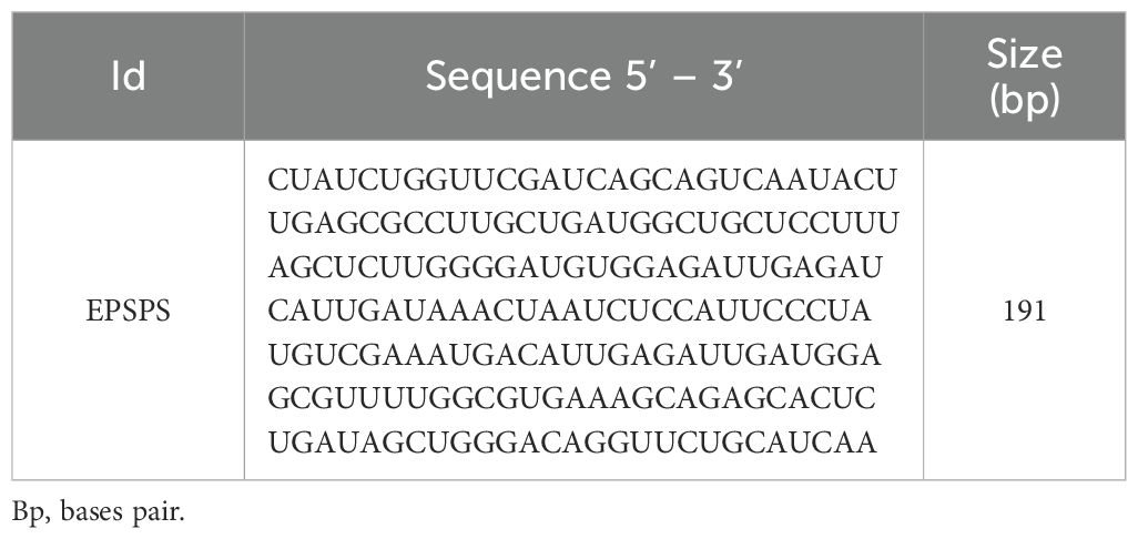 The fragments obtained by sequencing the EPSPS gene were analyzed using the siRNA Wizard software (https://www.invivogen.com/sirnawizard). The goal was to identify regions with the highest potential for generating siRNAs, based on the preferential cleavage sites of the DICER enzyme. From this analysis, a region with the highest probability of effectiveness for gene silencing was selected (Table 3), and submitted to an off-target analysis contrasting the fragment using BLASTn with the genomes of three key-species (Zea mays, Triticum aestivum and Glycine max). The dsRNA sequence was aligned with the gene for annotation using the IBS 2.0 software (Lamprecht et al., 2008; Xie et al., 2022).