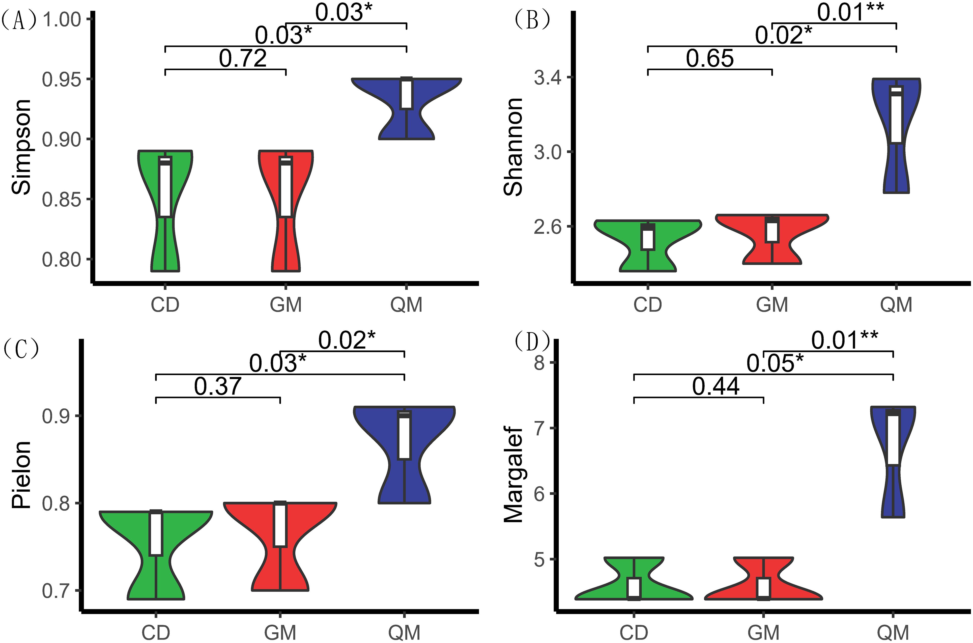 Four violin plots compare diversity indices across three groups: CD (green), GM (red), and QM (blue). (A) Simpson index with significant differences noted between groups. (B) Shannon index shows significant differences. (C) Pielou index with marked differences. (D) Margalef index, indicating statistical significance. Asterisks denote levels of significance.