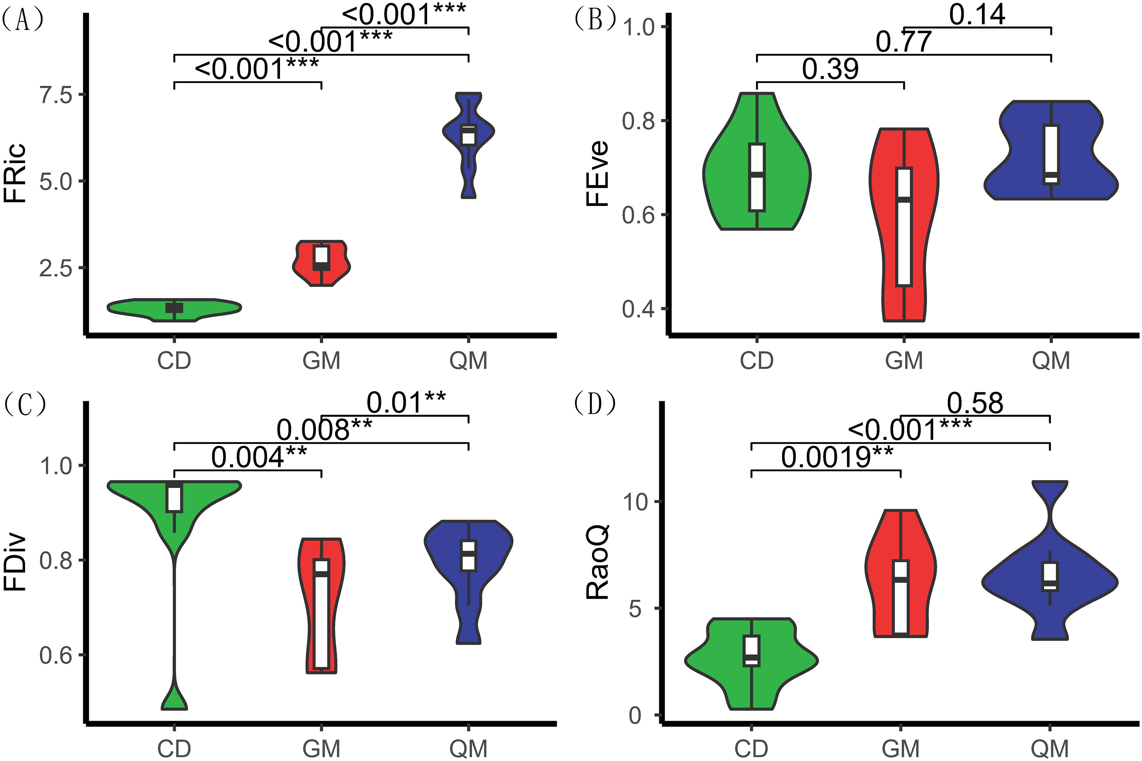 Four violin plots labeled A, B, C, and D compare the measures FRic, FEve, FDiv, and RaoQ across three groups: CD, GM, and QM. Each plot shows variations in data distribution, with significant p-values marked to indicate statistical differences between groups.