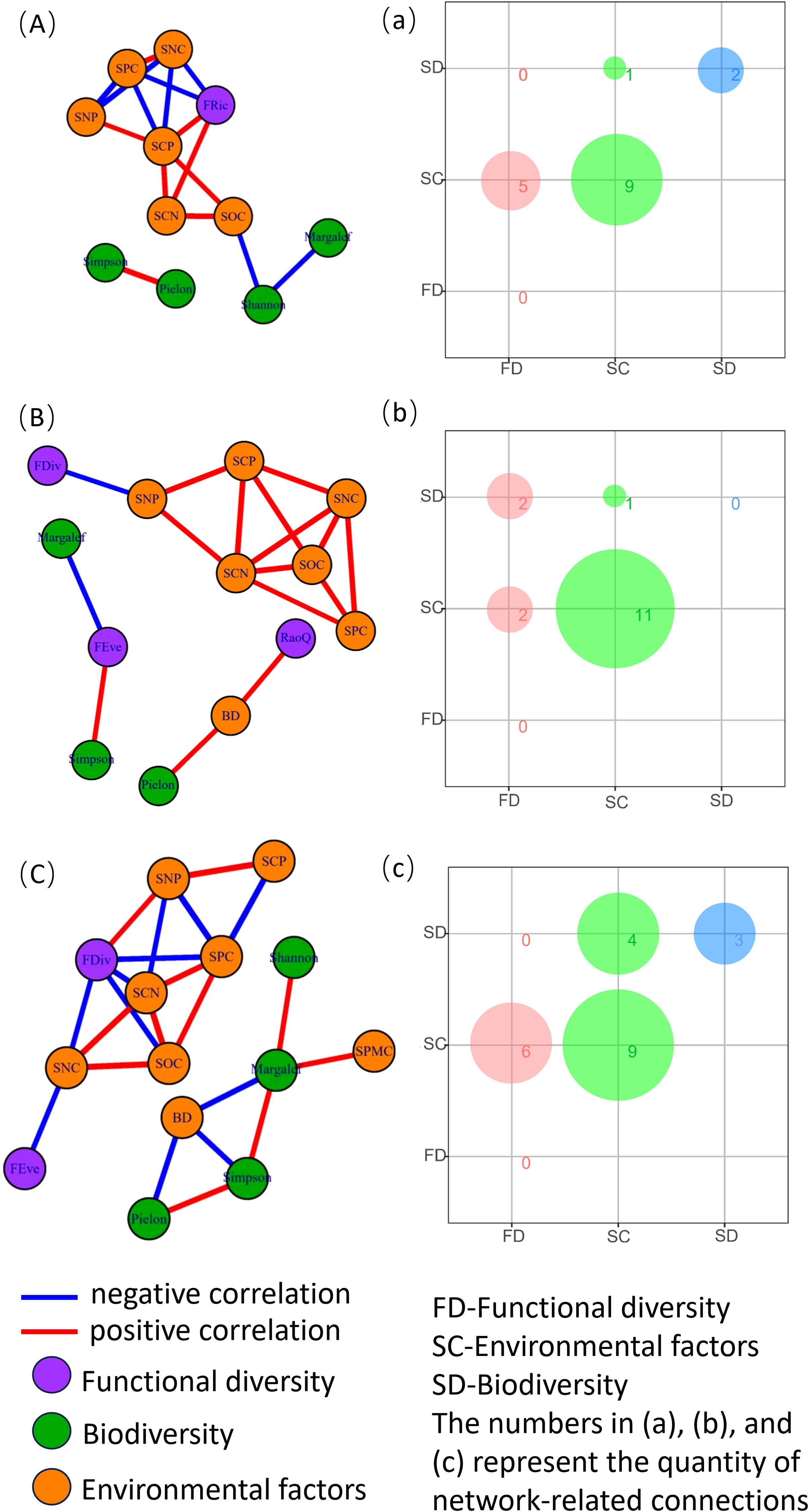 Network diagrams (A, B, C) depict correlations among functional diversity, biodiversity, and environmental factors using colored nodes: purple for functional diversity, green for biodiversity, and orange for environmental factors. Lines represent correlations: blue for negative and red for positive. Accompanying bubble plots (a, b, c) compare the number of network-related connections across functional diversity (FD), environmental factors (SC), and biodiversity (SD). Bubble sizes illustrate connection quantities, with details outlined in the legend.