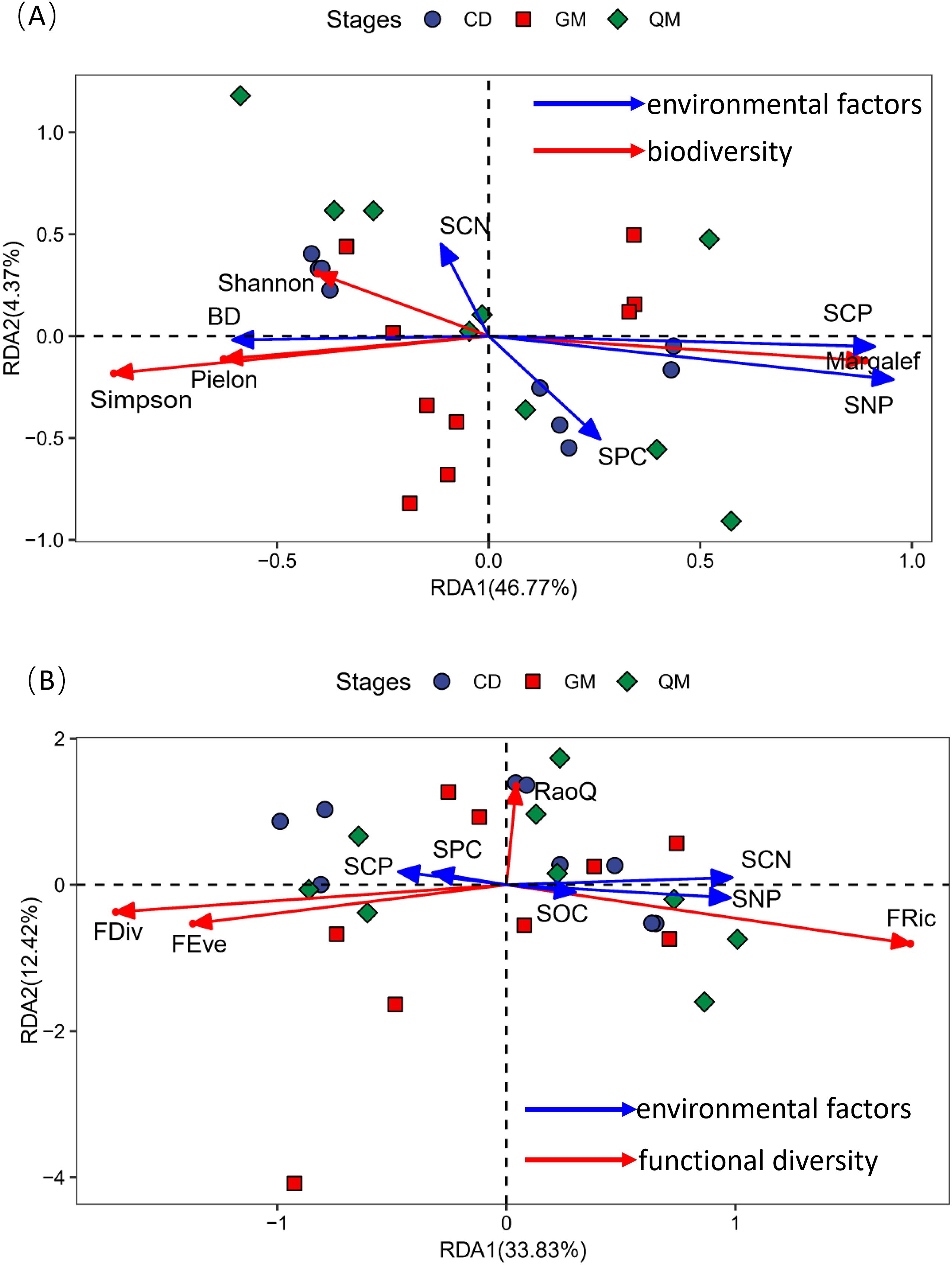 Two redundancy analysis (RDA) biplots labeled A and B. Plot A shows stages CD, GM, and QM with biodiversity factors marked as circles, squares, and diamonds, respectively. Environmental factors are indicated by blue arrows and biodiversity by red arrows. Plot B displays stages with similar markers, showing environmental factors with blue arrows and functional diversity with red arrows. The axes in both plots indicate different RDA percentages, with key variables labeled near their respective points or arrows.
