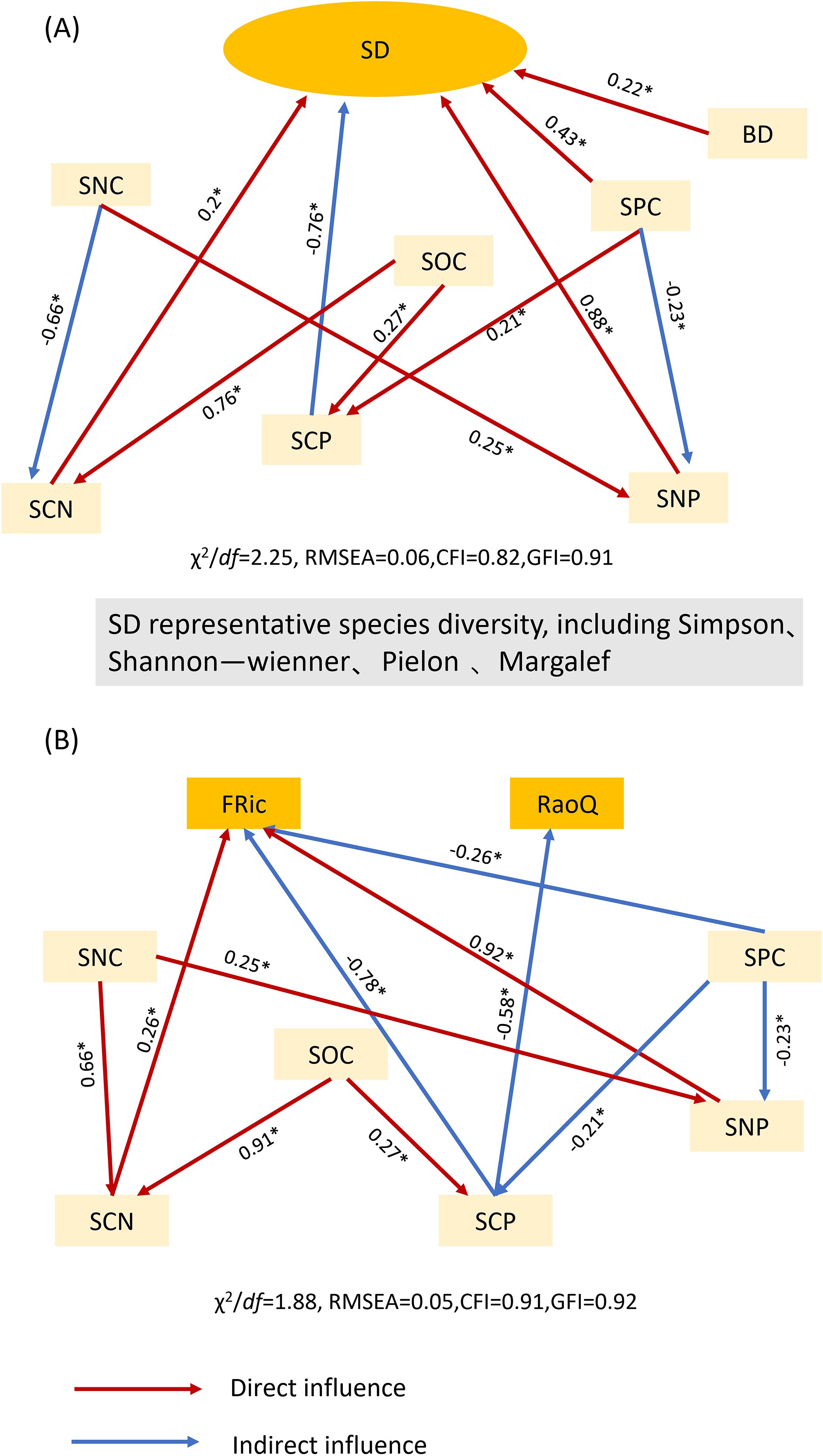 Figure 5. Structural equation modeling of soil factors and community diversity. (A) Structural equation modeling of soil factors and community species diversity; (B) structural equation modeling of soil factors and community functional diversity. The abbreviations for the functional diversity indices are listed in Table 2, whereas those for environmental factors are shown in Figure 3. χ² denotes the chi-squared test for goodness of fit; df denotes degrees of freedom; χ²/df denotes the ratio of chi-squared to degrees of freedom; GFI denotes the goodness-of-fit index; RMSEA denotes the root mean square error of approximation; and CFI denotes the comparative fit index. * denotes significant differences (P < 0.05).