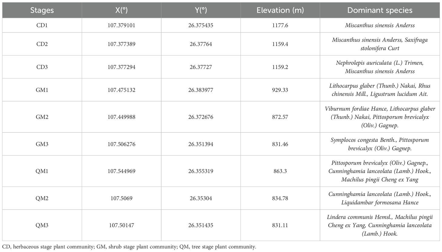 Duyun City is located in the southeastern part of Guizhou Province, China, between longitudes 107°07′19″E–107°46′26″E and latitudes 25°51′26″N–26°25′39″N. The sample area is located within the eastern subtropical evergreen broad-leaved forest zone of China, characterized by uniformly distributed soil thickness. Detailed information about the sample site is provided in Table 1. The Duyun Doupeng Mountain Reserve in Guizhou lies within the broad-leaved evergreen forest region of eastern subtropical China. The reserve exhibits significant altitudinal variation, predominantly limestone geology, uneven soil thickness distribution, and moist soils, creating favorable conditions for plant growth across different elevations. Consequently, the forests in this area consist primarily of natural vegetation with high originality and diverse forest types, including evergreen broad-leaved forests, evergreen-deciduous mixed forests, deciduous broad-leaved mixed forests, deciduous broad-leaved forests, and broad-leaved mixed forests. Additionally, the region contains coniferous forests, coniferous-broad-leaved mixed forests, and bamboo forests. The average annual rainfall is 1,431.1 mm, and the average annual temperature is 16.0°C.
