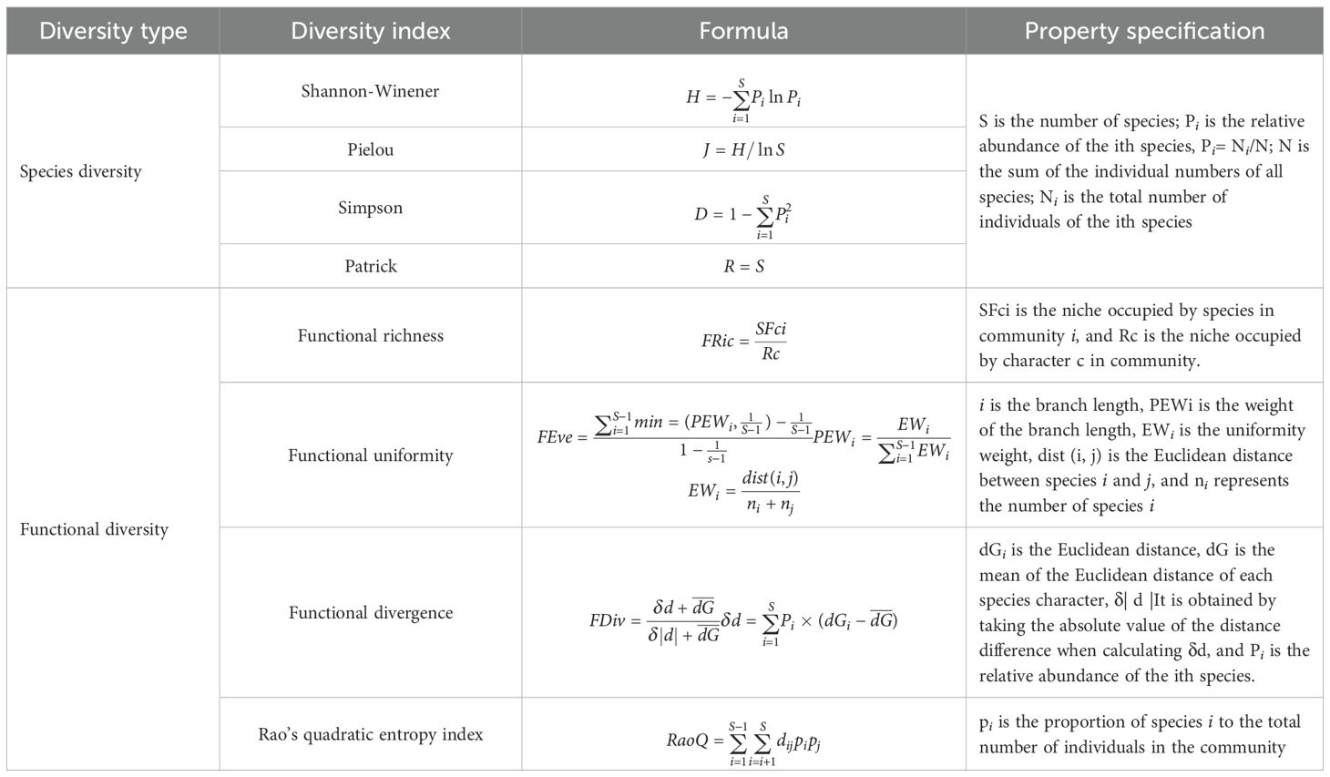Seven indicators—leaf thickness, leaf area, leaf dry matter mass, specific leaf area, chlorophyll content, leaf aspect ratio, and leaf tissue density—were selected as functional traits and used as the basis for calculating functional diversity. For the determination of leaf traits, fresh mass was first measured using an electronic balance (BSM-220.4, Shanghai Joujing Electronic Technology Co., Ltd., Shanghai, China) with an accuracy of 0.0001 g. Subsequently, the leaf area (LA, cm²) of each leaf was measured using a leaf area meter (Yaxin-1241, Beijing Yaxin Instrument Technology Co., Ltd., Beijing, China). The leaf area was then divided into two fractions using a portable chlorophyll content meter (SPAD-502 Plus, Konica Minolta, Tokyo, Japan). Leaf thickness (LT, mm) and chlorophyll content (CHL, SPAD) were also measured with the same portable chlorophyll content meter. After these measurements, the leaves were placed in numbered envelopes and dried in an oven at 80°C for 72 h until a constant mass was achieved. The dry mass of the leaves (LDM, g) was then weighed and recorded. Specific leaf area (SLA, cm²/g), leaf dry matter content (LDMC, mg/g), and leaf tissue density (LTD, g/cm³) were calculated based on the ratios of leaf area to leaf dry mass, leaf dry mass to fresh leaf mass, and leaf dry mass to leaf volume (calculated as leaf area multiplied by leaf thickness).