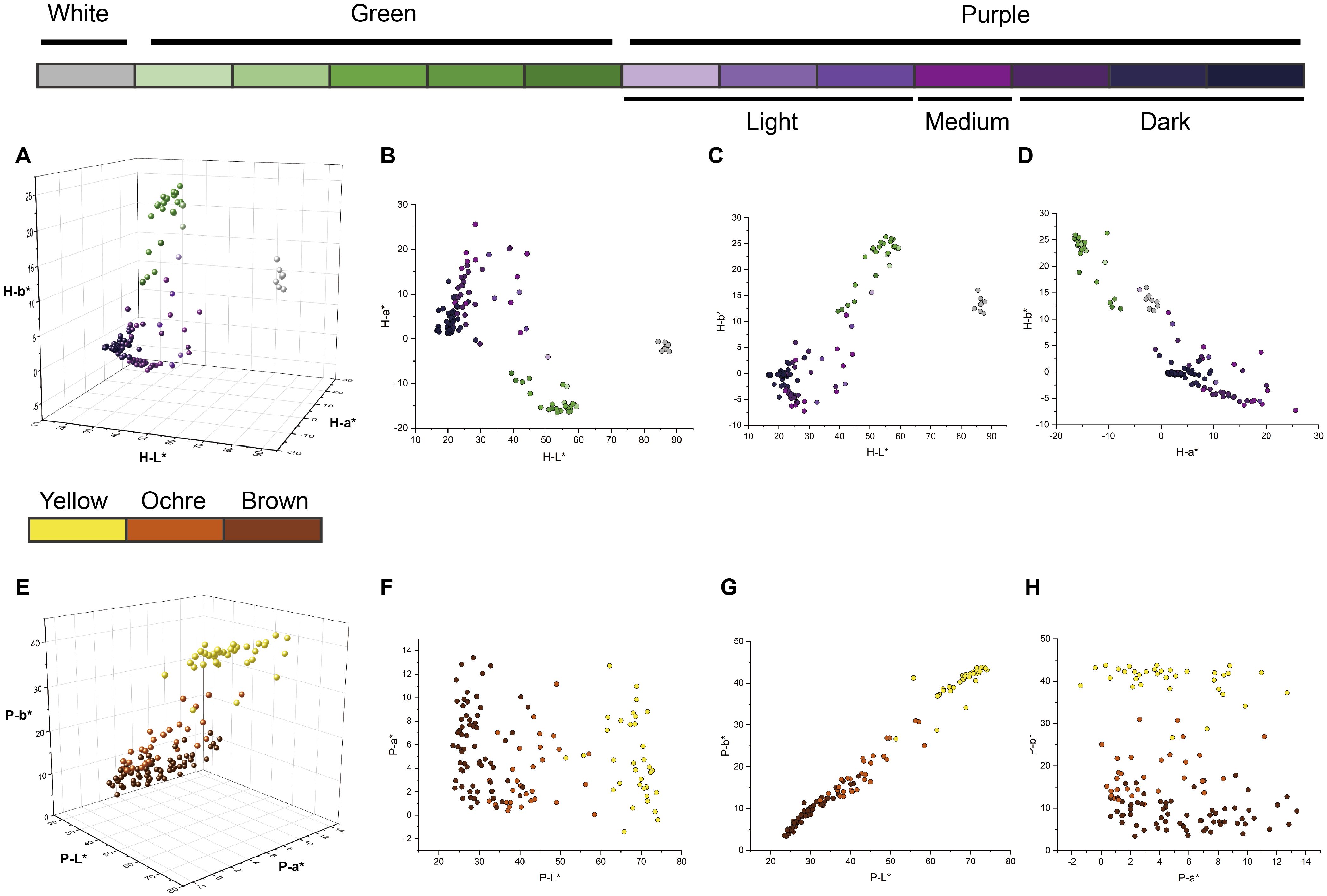 Figure 3. Distribution diagrams of L*, a*, and b* values of different colors and color intensities of harvest-maturity fruits and physiological ripeness fruits. The colors of the dots correspond to the types of eggplant fruit colors indicated by the same color block as in Figure 1. (A) 3D distribution diagrams of the L*, a*, and b* values of harvest-maturity fruits. (B–D) Distribution diagrams of the L*, a*, and b* values of harvest-maturity fruits in the 2D projection. (E) 3D distribution diagrams of the L*, a*, and b* values of the physiological ripeness fruits. (F–H) Distribution diagrams of the L*, a*, and b* values of physiological ripeness fruits in the 2D projection.