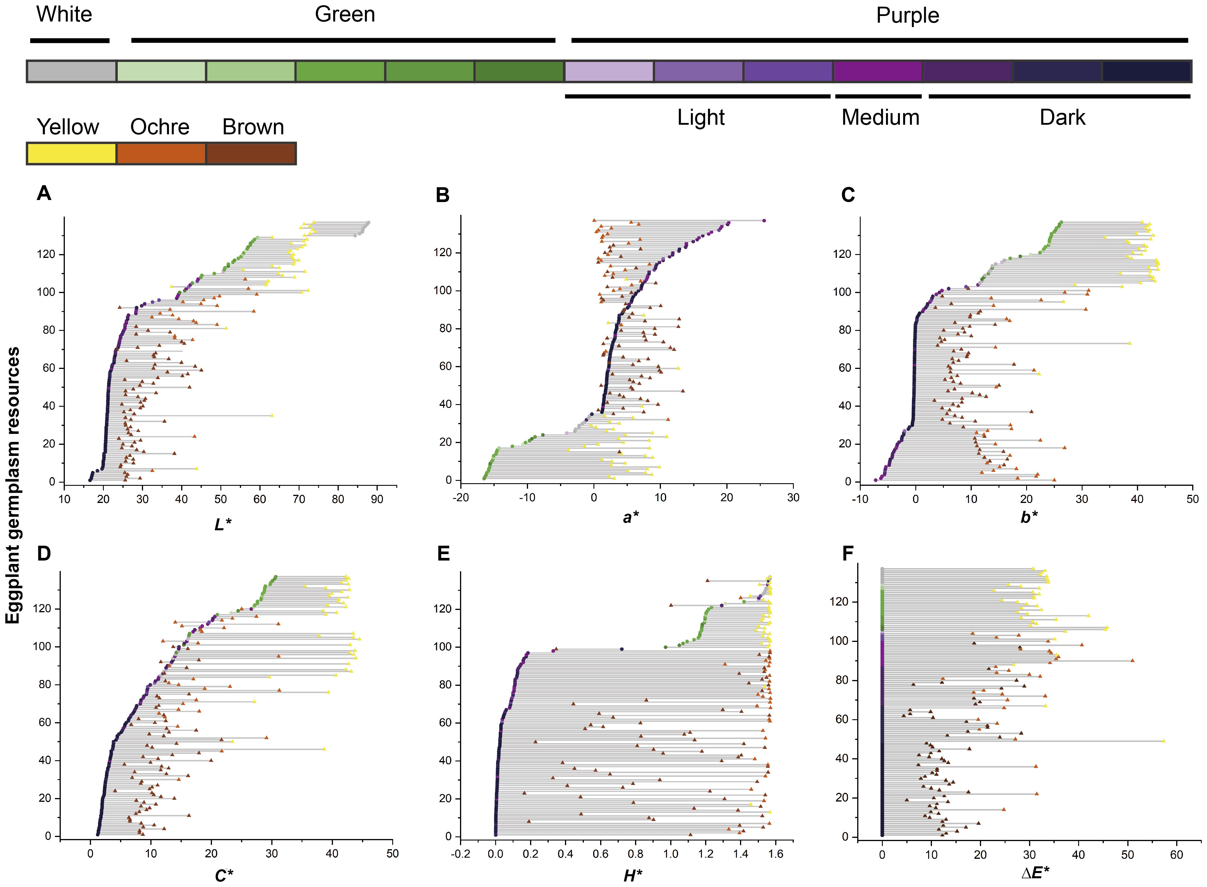 Figure 4. Temporal changes in eggplant fruit color parameters. The vertical axis represents the serial number of the eggplant resource samples. (A–E) The arrangement orders of the samples were sorted in increasing order according to the values of L*, a*, b*, C*, and H* at harvest maturity. (F) The arrangement orders of the samples were sorted in descending order according to the color intensity of the harvest-maturity fruits. Dots represent harvest-maturity fruits, and triangles represent physiological ripeness fruits. The colors of the dots and triangles correspond to the types of eggplant fruit colors indicated by the same color blocks as in Figure 1.