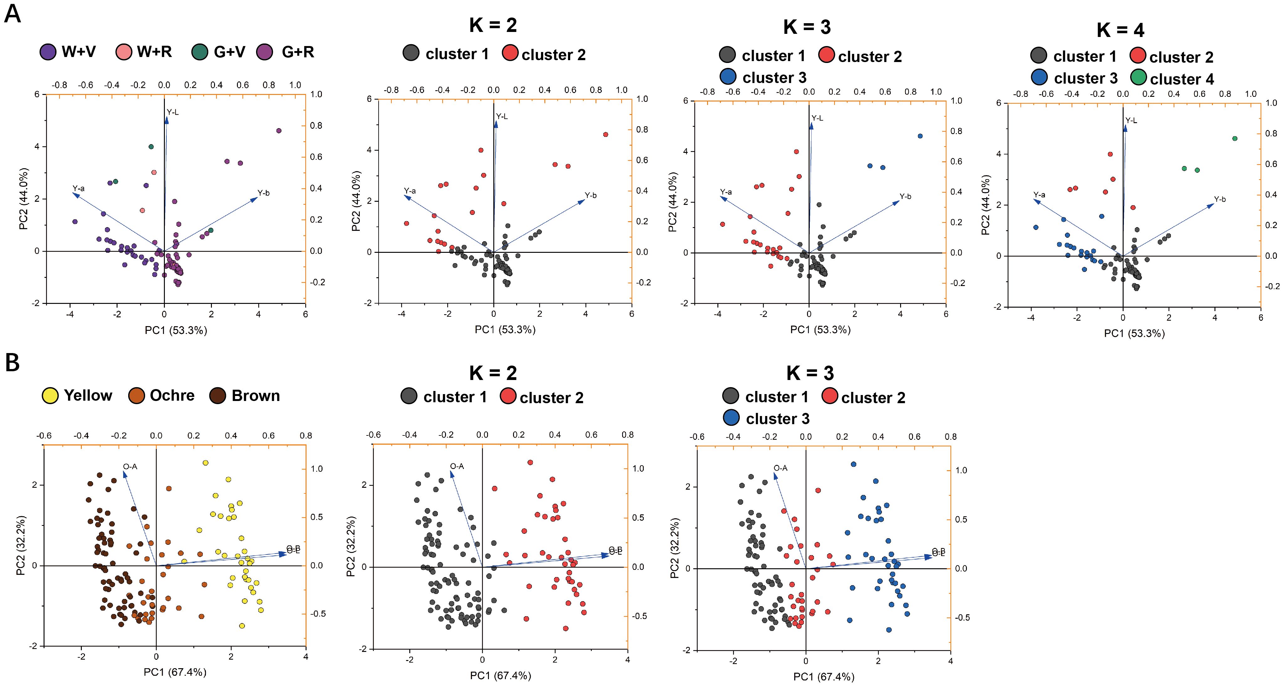 The correspondence between the artificial and K-means classifications was visualized using principal component score plots (Figure 6). This comparison aimed to determine whether the unsupervised K-means algorithm could replicate expert-based morphological classifications or identify alternative data-driven groupings from the CIELAB parameters. The optimal cluster number (K) determined by the Elbow Method and Silhouette Coefficient was two or three for the harvest maturity stage of purple fruits and the physiological ripeness stage of all germplasm accessions (Supplementary Figure S2). Given that the artificial classification divided purple fruits into four categories (Figure 5), K values of 2, 3, and 4 were tested at the harvest-maturity stage.
