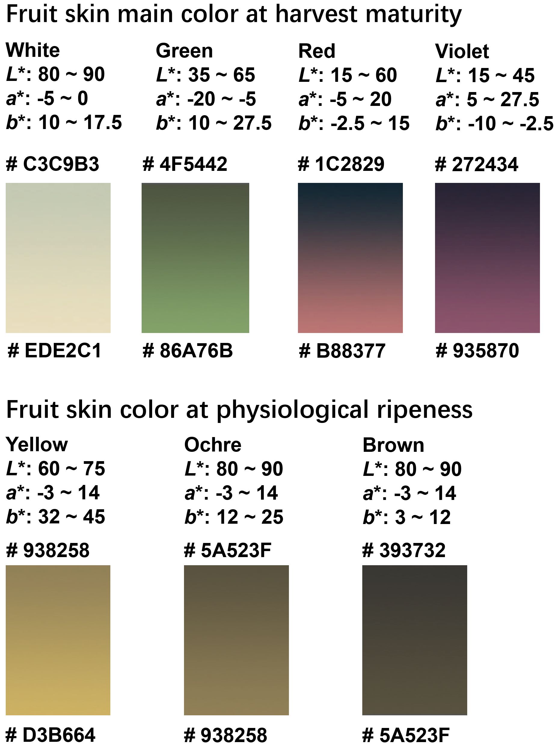 Figure 7. Gradient color blocks used to describe the color range of fruit-color traits at harvest maturity and physiological ripeness. The gradients were formed based on the range of L*, a*, and b* values of each color type, and their respective RGB codes were marked.