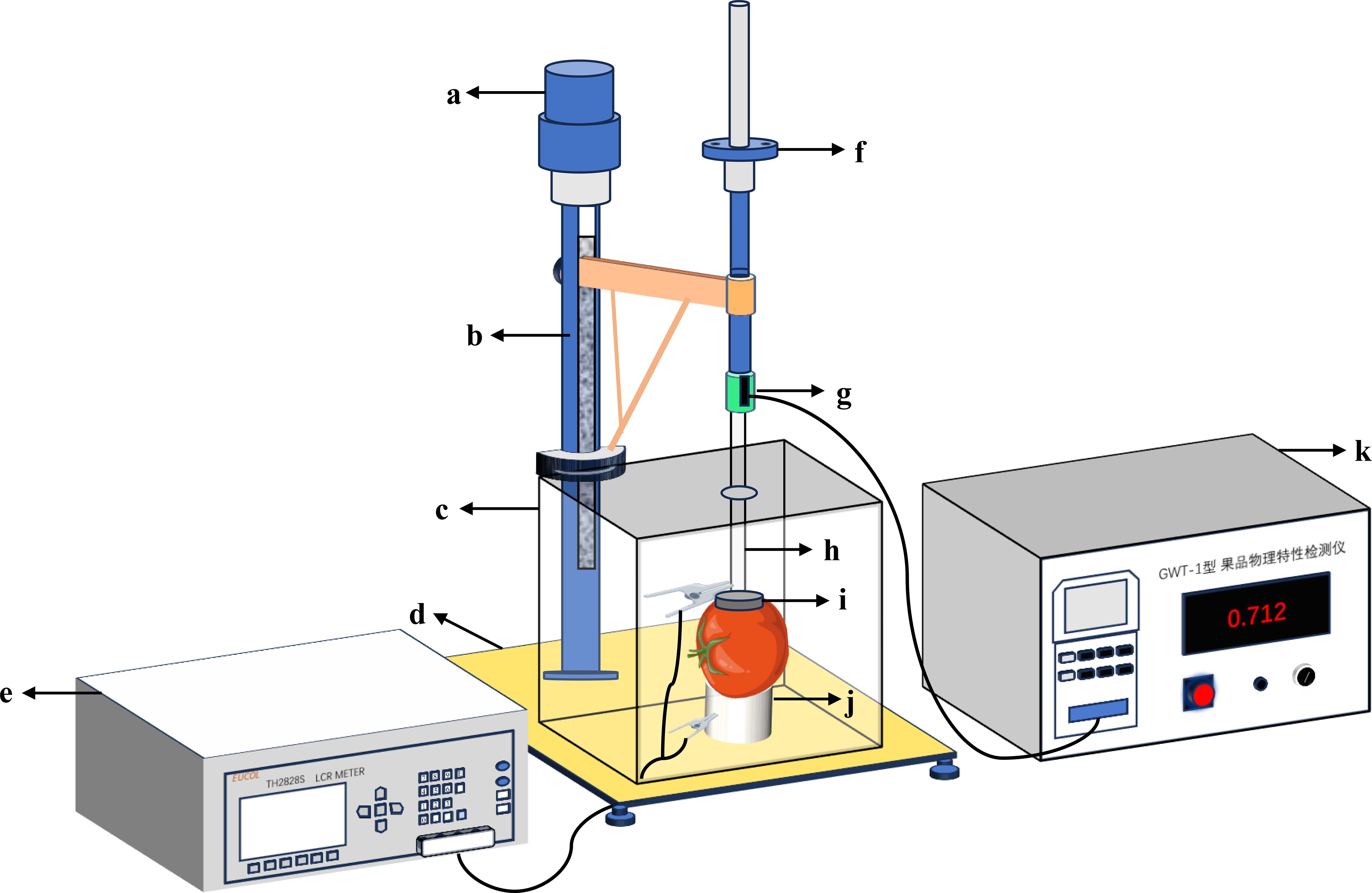 Figure 3. Tomato electrical parameters measurement device. The meaning of the numbers in the picture: (a) Loading motor; (b) Support frame; (c) Shielding box; (d) Base; (e) Testing bridge; (f) Fine-tuning handwheel; (g) Force sensor; (h) Insulating rod; (i) Upper electrode plate; (j) Lower electrode plate; (k) Force control unit.