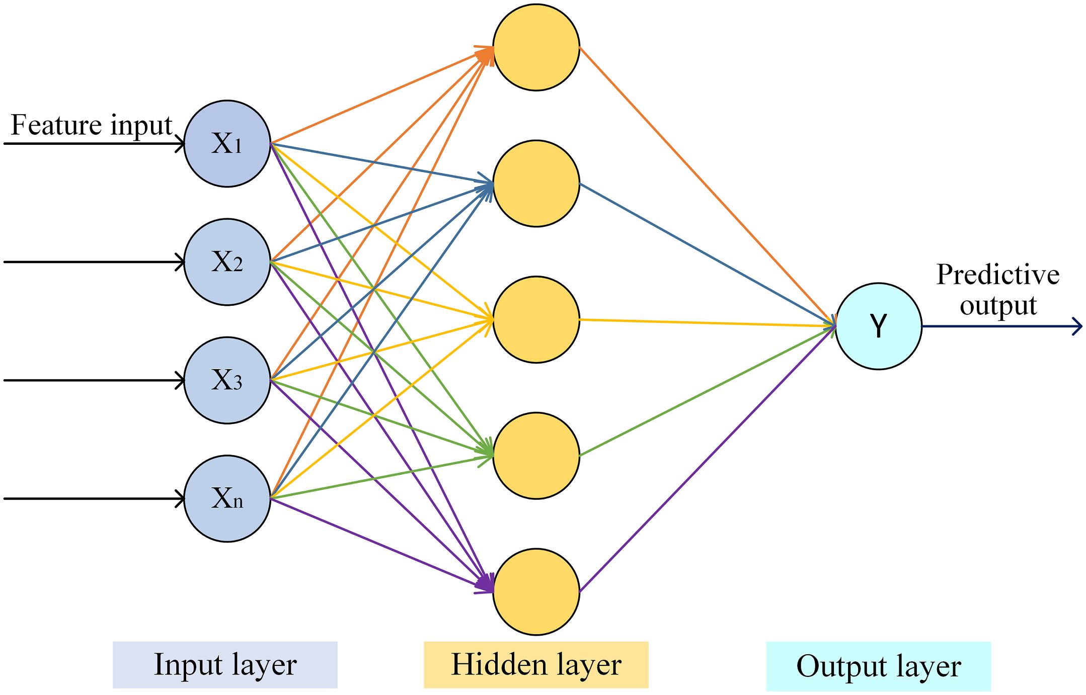 The MLP, also known as an Artificial Neural Network (ANN), consists of multiple layers including input and output layers, with one or more hidden layers in between. The simplest MLP has a single hidden layer, forming a three-layer structure. A simple MLP structure is depicted in Figure 6.