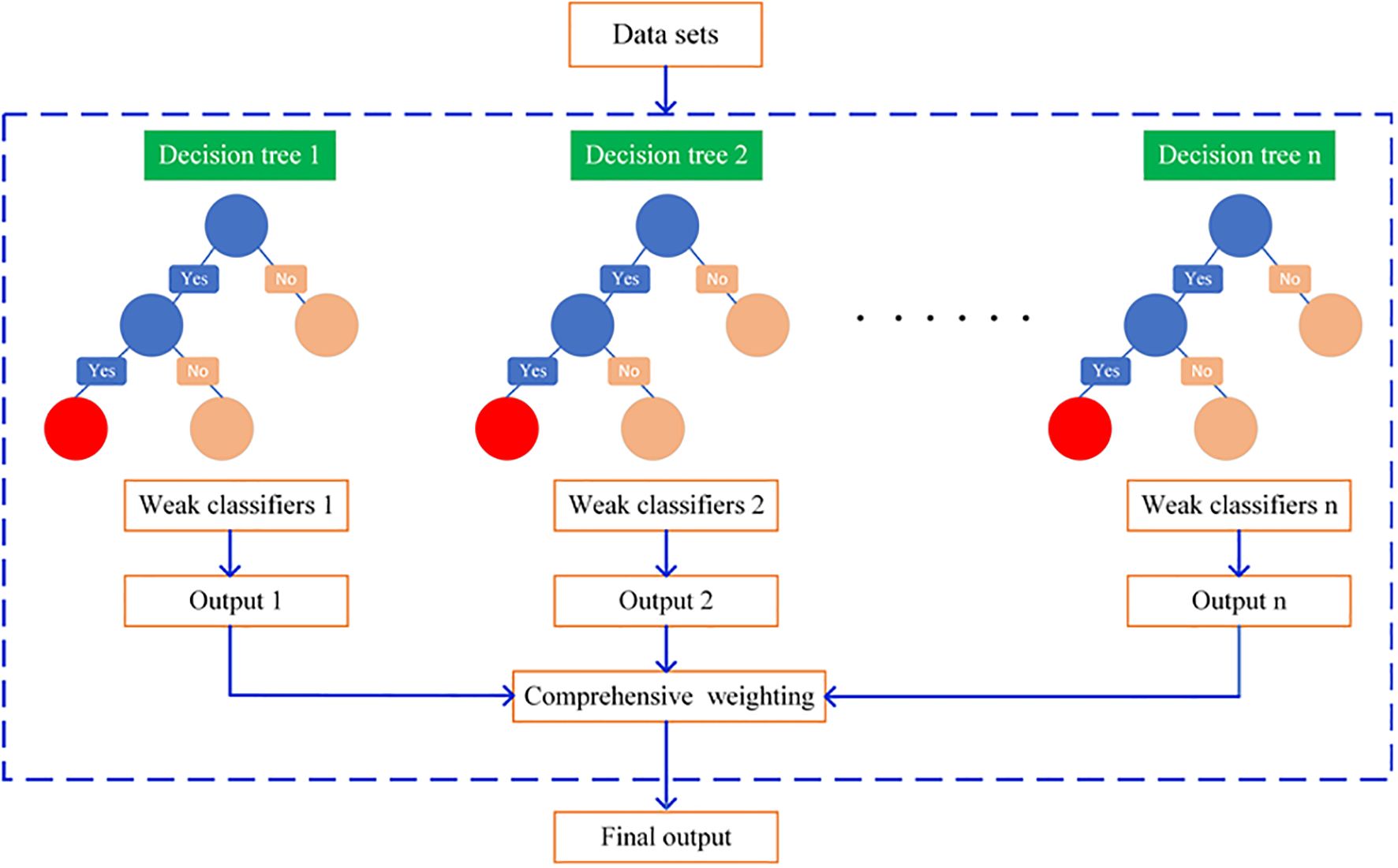 The Gradient Boosting Decision Tree (GBDT) algorithm employs gradient descent to construct new trees based on all previously developed trees, aiming to minimize the objective function as much as possible. The XGBoost algorithm is an enhancement built upon GBDT and is extensively utilized for both classification and regression tasks. As shown in Figure 7, by incorporating regression trees, the model continuously performs feature splitting learning at each internal node, generating new Classification and Regression Trees (CART), fitting the residuals from previous models, and recording the number of trees in the training model. The weights of the results corresponding to each tree are then combined to produce the final prediction values. The weights of the results corresponding to each tree are then combined to produce the final prediction values. The predicted value of the model is calculated as shown in Equation 12: