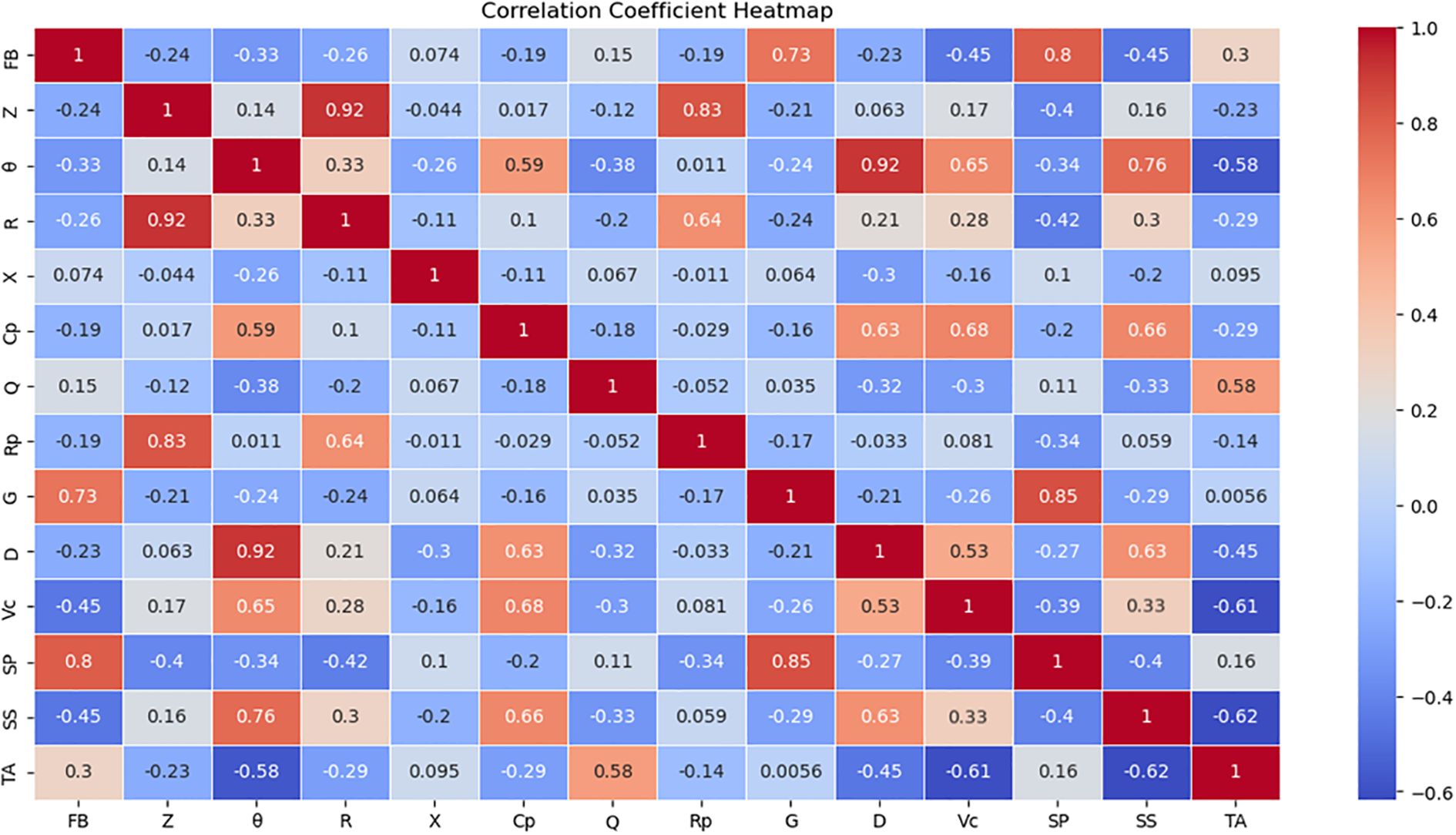 Feature extraction is performed using the Pearson correlation coefficient, where the value of the correlation coefficient (r) ranges from [-1, 1]. A larger absolute value of (r) indicates a higher degree of correlation, while a correlation coefficient of 0 signifies no correlation. The calculation formula for r is presented in Equation 2.
