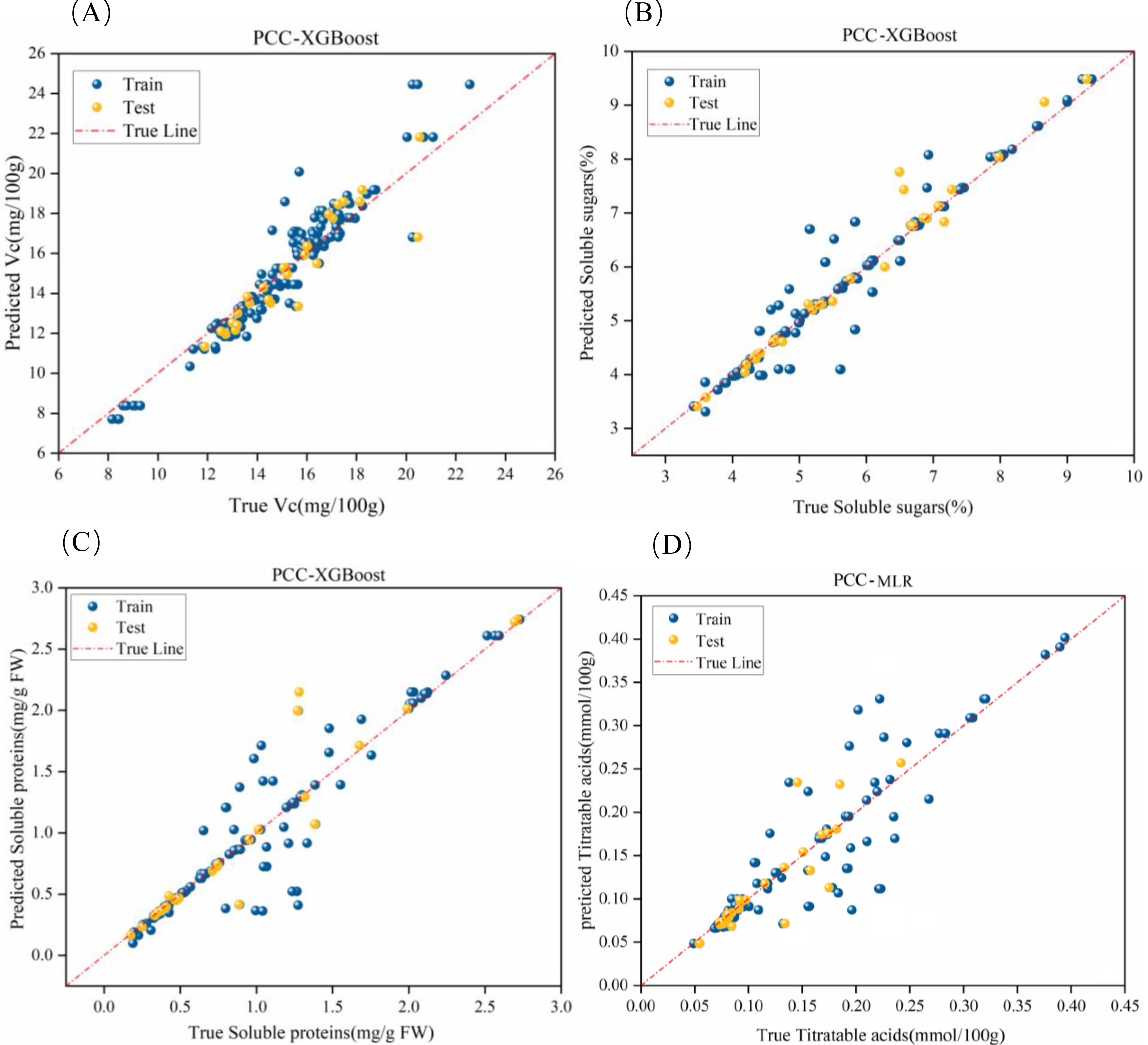 2. When using PCC for feature extraction and recombining the extracted features as input for three regression models—SVR, MLP, and XGBoost—PCC-XGBoost out-performed the other two models in predicting vitamin C, soluble sugar, and soluble protein indicators. However, for the prediction of titratable acidity, the PCC-MLP model provided better results.
