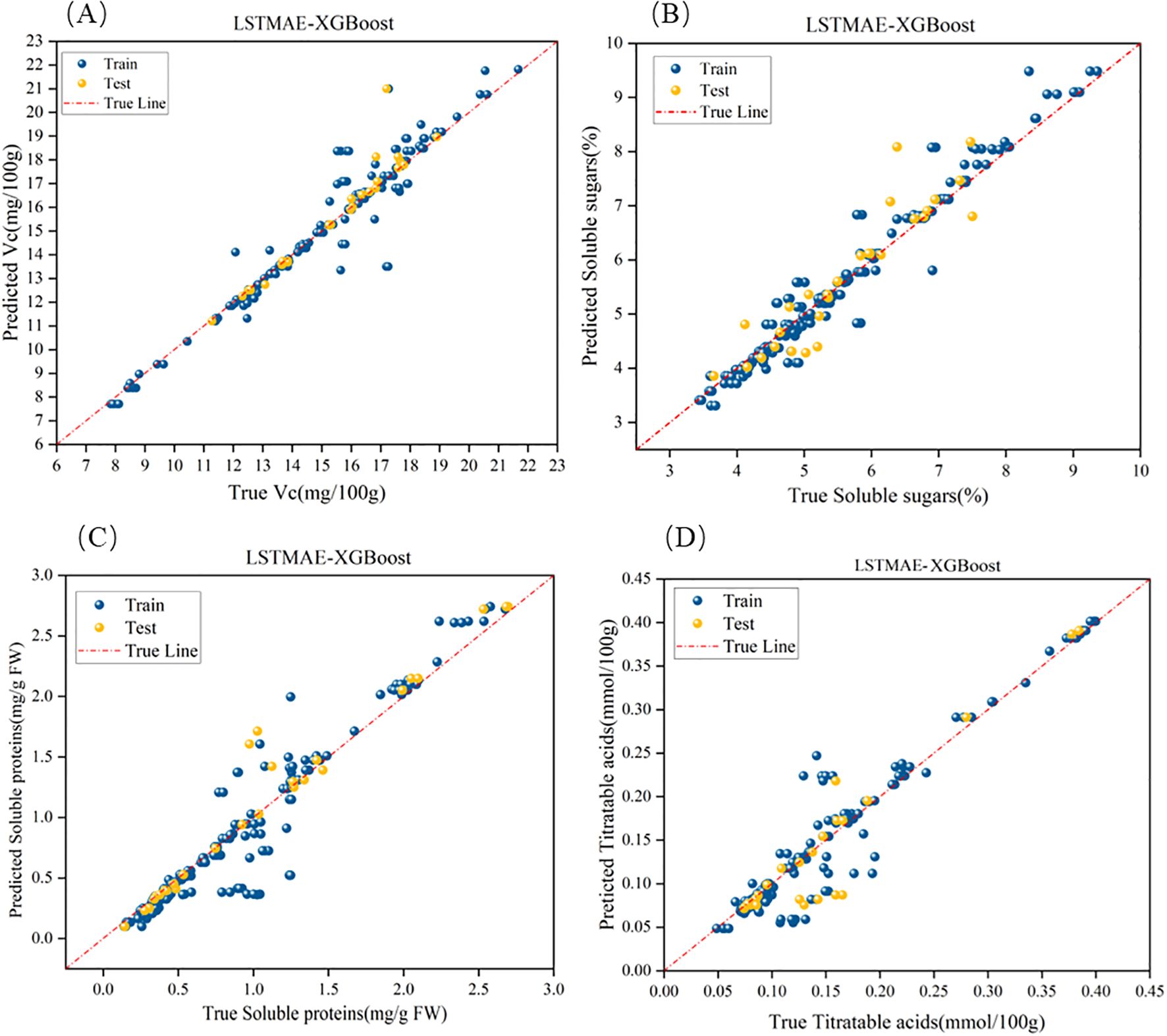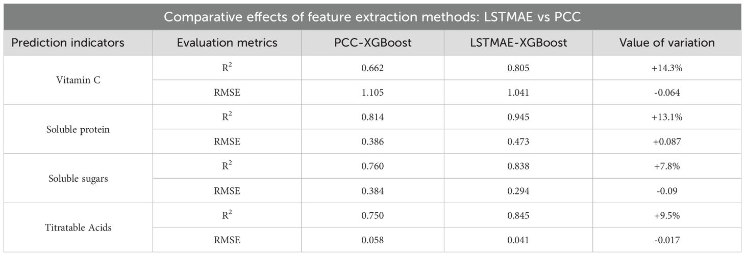 1. By comparison, it was found that using the LSTMAE model for input feature extraction outperformed PCC. The coefficients of determination (R²) for vitamin C, soluble sugar, soluble protein, and titratable acidity improved by 14.3%, 13.1%, 7.8%, and 9.5%, respectively.