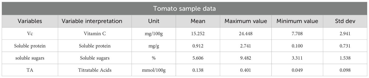 Following the measurement of electrical parameters, the tomatoes were ground into a homogeneous pulp for the determination of key quality indices. Four critical quality indices of tomatoes were analyzed: soluble sugars, titratable acidity, vitamin C, and soluble proteins. Soluble sugar content was determined using the anthrone colorimetric method (Ibba, 2021; Palumbo et al., 2023); soluble protein content was assessed using the Coomassie Brilliant Blue G-250 staining method (Zhang et al., 2022); titratable acidity was measured by acidimetric titration (Yu et al., 2022); and vitamin C was quantified using UV spectrophotometry (Ye et al., 2023). For each measurement, 60 fruit samples were tested in replicate, and the average value was taken as the final result for each sample. The finally measured quality indicator data are shown in Table 1.