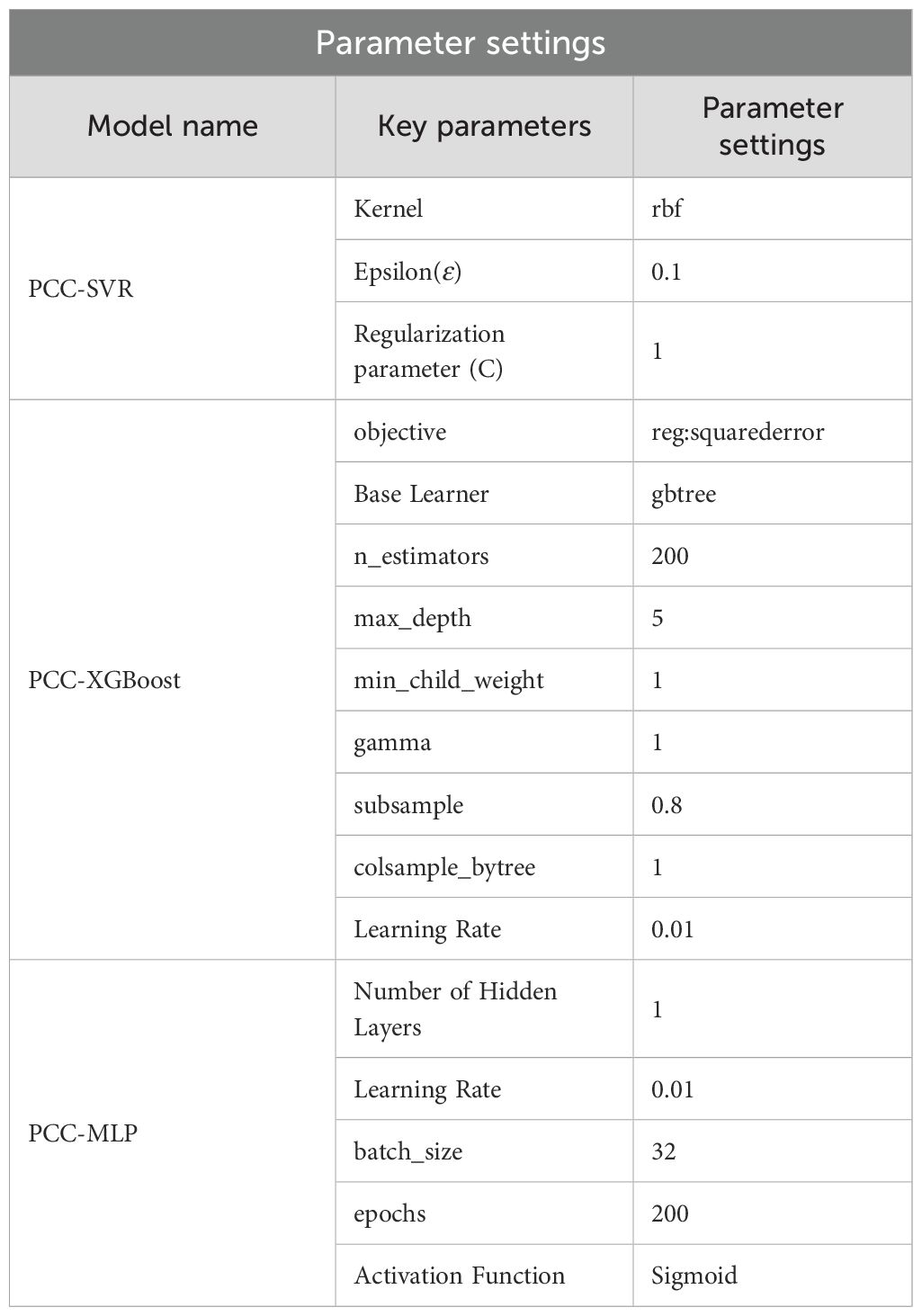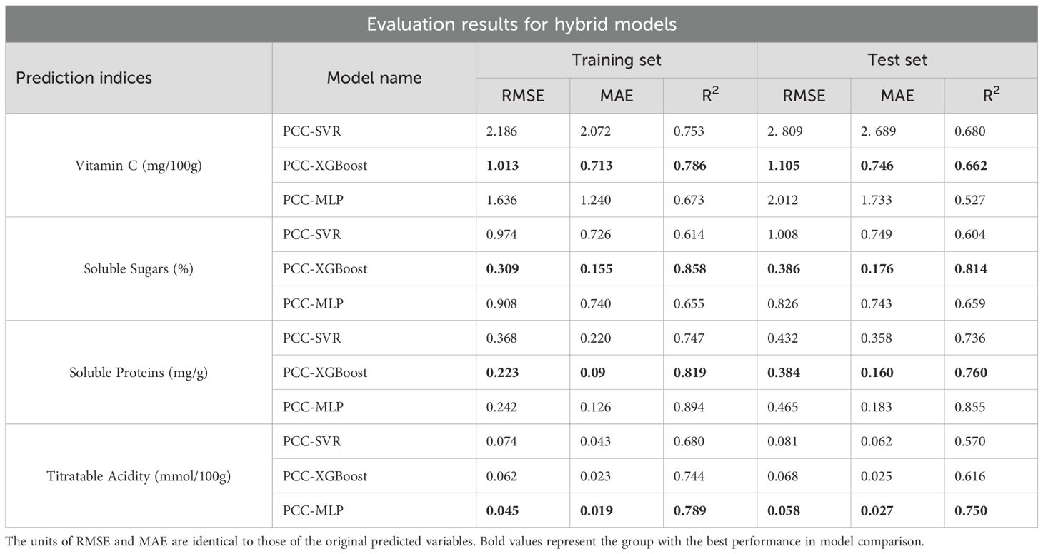 As shown in Figure 8, there exists a certain correlation between vitamin C (VC), soluble protein, soluble sugars, titratable acidity (TA), and the electrical parameters. Parameters with higher correlation levels were selected for model construction. VC content demonstrated moderate positive correlations with capacitance (Cp, r=0.68), phase angle (θ, r=0.65), and dissipation factor (D, r=0.53). The variation in VC content is closely associated with the integrity of cellular structure, while parameters such as capacitance (Cp) and phase angle (θ) effectively capture these cellular-level changes. Consequently, Cp, θ, and D were selected as input features for predicting VC content using PCC-SVR, MLP, and XGBoost models.Soluble protein content showed a significant positive correlation with conductance (G). As the soluble protein content increases, it effectively enhances the internal ‘electrical conductivity’ of the tomato fruit, facilitating easier passage of electrical current, which manifests as an elevation in the G-value. Concurrently, a positive correlation was observed with frequency band variation indicators. Consequently, G and the Frequency Band parameter were selected as input features for predicting soluble protein content using the PCC-SVR, MLP, and XGBoost models. Soluble sugar content demonstrated moderate positive correlations with phase angle (θ, r=0.76), parallel capacitance (Cp, r=0.66), and dissipation factor (D, r=0.63). These parameters exhibit high sensitivity to variations in internal sugar content and were consequently selected as input features for predicting soluble sugar concentration using PCC-SVR, MLP, and XGBoost models. Titratable acid showed a moderate correlation with θ (r = -0.58) and Q (r = 0.58). An increase in acidity enhances the resistive pathway by increasing ionic conductivity, reduces the capacitive response (θ decreases), and simultaneously optimizes the energy transmission efficiency (Q increases). Therefore, θ and Q were selected as input features for predicting titratable acid content using PCC-SVR, MLP, and XGBoost models.