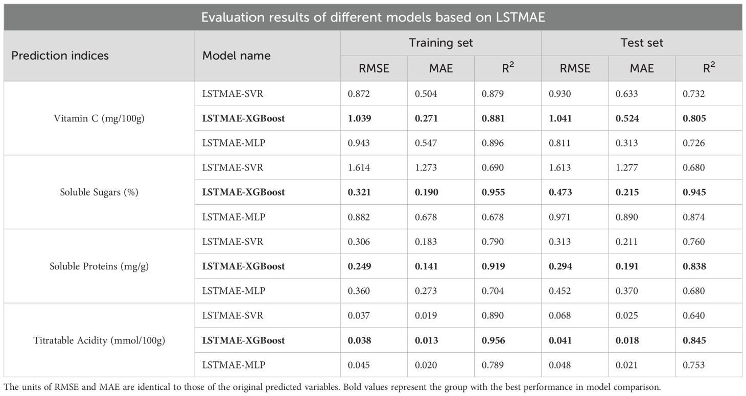 3. By utilizing LSTMAE for automatic feature learning, LSTMAE-XGBoost out-performed the other two models in predicting vitamin C, soluble sugar, and soluble protein indicators. Additionally, the LSTMAE-XGBoost model can simultaneously predict all four indicators, resulting in superior model efficiency compared to traditional machine learning models.
