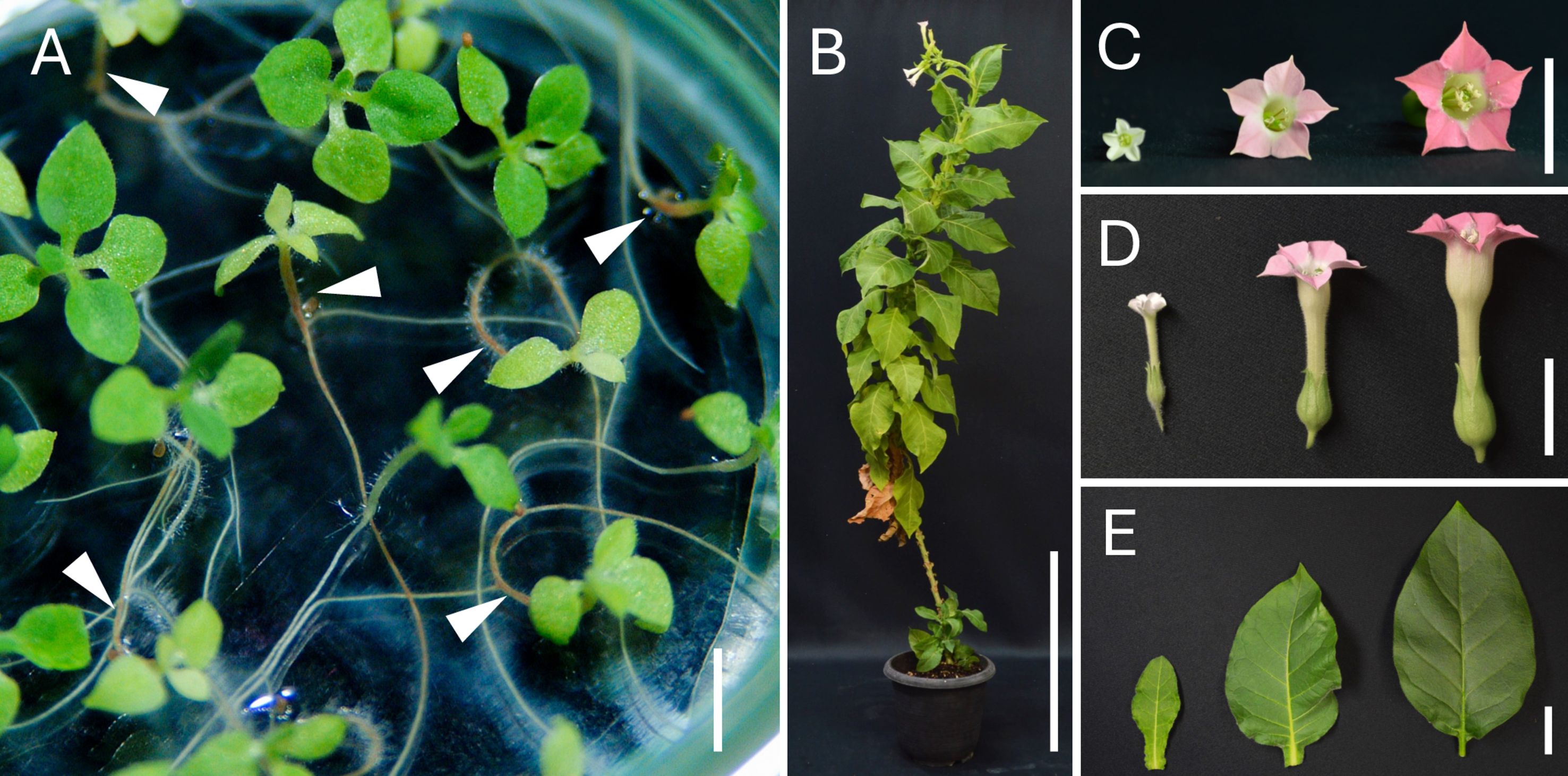 Figure 1. Hybrid seedlings and plants from the cross N. amplexicaulis JT × N. tabacum. (A) Characteristic early symptoms of hybrid lethality in the hybrid seedlings from the cross N. amplexicaulis × ‘Red Russian’. Arrowheads indicate browning of hypocotyl and roots, which is characteristic of type II hybrid lethality. (B) Shape of a viable hybrid plant from the cross N. amplexicaulis × ‘Samsun NN’ that has grown to maturity and flowered. (C, D) Flowers of N. amplexicaulis, a viable hybrid plant, and ‘Samsun NN’ (left to right). (E) Leaves of N. amplexicaulis, a viable hybrid plant, and ‘Samsun NN’ (left to right). Scale bars = 0.5 cm (A), 30 cm (B), and 2 cm (C-E).