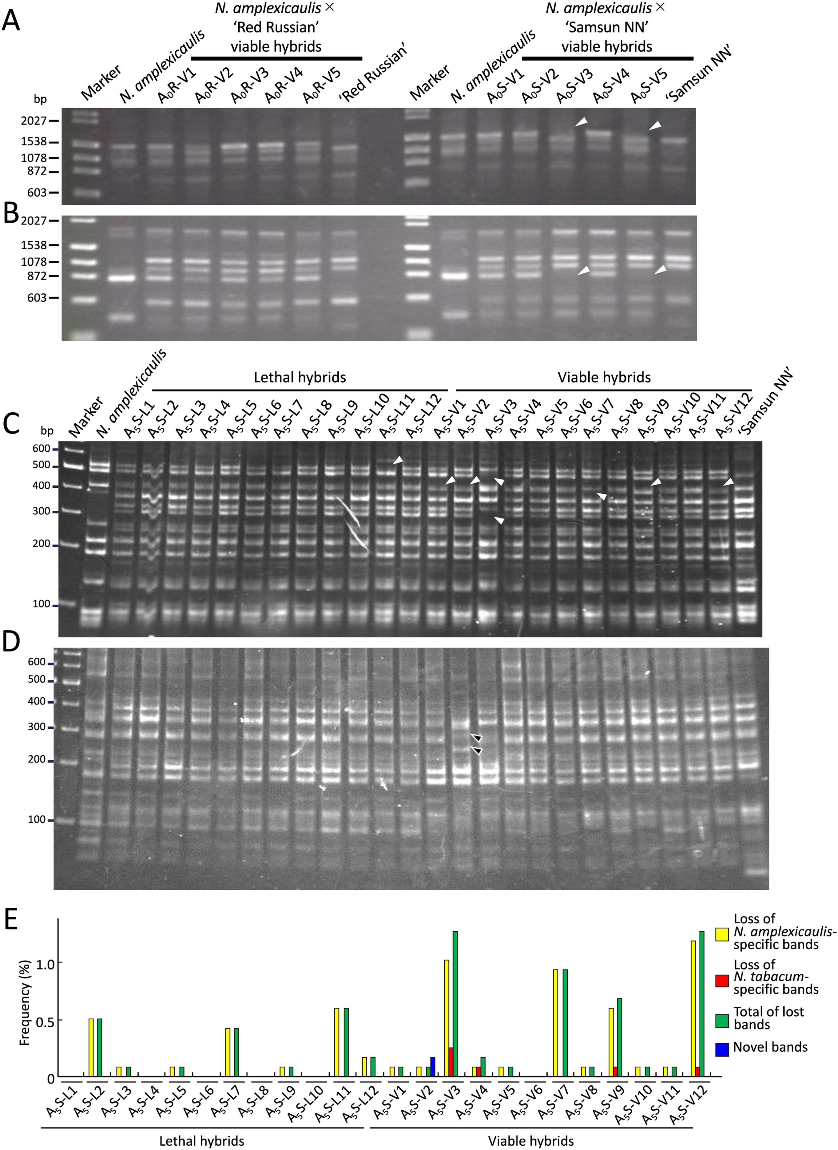 Figure 2. Genetic changes in hybrid plants identified by RAPD and AFLP analysis. (A, B) Loss of bands identified in hybrid plants by RAPD analysis using primers OPA-05 (A) and OPA-09 (B). White arrowheads indicate the disappeared bands. Marker lane, DNA size markers (λ/Hind III and φX174/Hae III). (C) Lost bands identified in hybrid plants by AFLP analysis using E40-M55 primer pair. White arrowheads indicate the disappeared bands. Marker lane, DNA size marker (GeneRuler DNA ladder mix). (D) Nobel bands identified in hybrid plants by AFLP analysis using E39-M49 primer pair. Black arrowheads indicate novel bands. Marker lane, DNA size marker (GeneRuler DNA ladder mix). (E) Frequency of lost or novel bands in each hybrid identified by AFLP analysis.