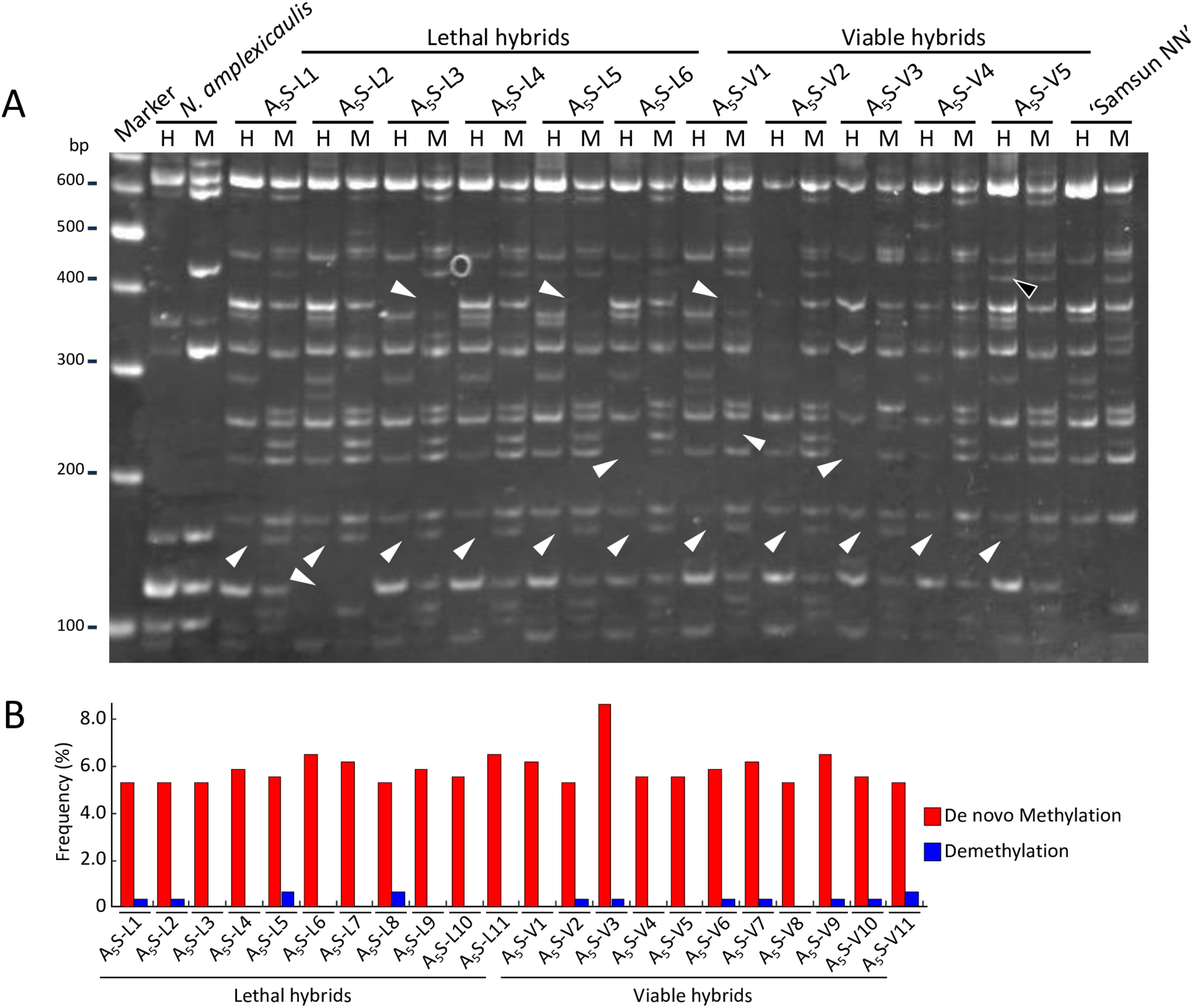 Figure 3. Epigenetic changes in hybrid plants identified by MSAP analysis. (A) An example of bands indicating variation of DNA methylation with the E35-HM49 primer pair. Lane H, PCR products obtained by digestion with EcoRI–HpaII; lane M, PCR products obtained by digestion with EcoRI–MspI; Marker lane, DNA size marker (GeneRuler DNA ladder mix). White arrowheads indicate MSAP bands showing de novo methylation, and black arrowheads indicate MSAP bands showing demethylation. (B) Frequency of methylation changes in each hybrid identified by MSAP analysis.