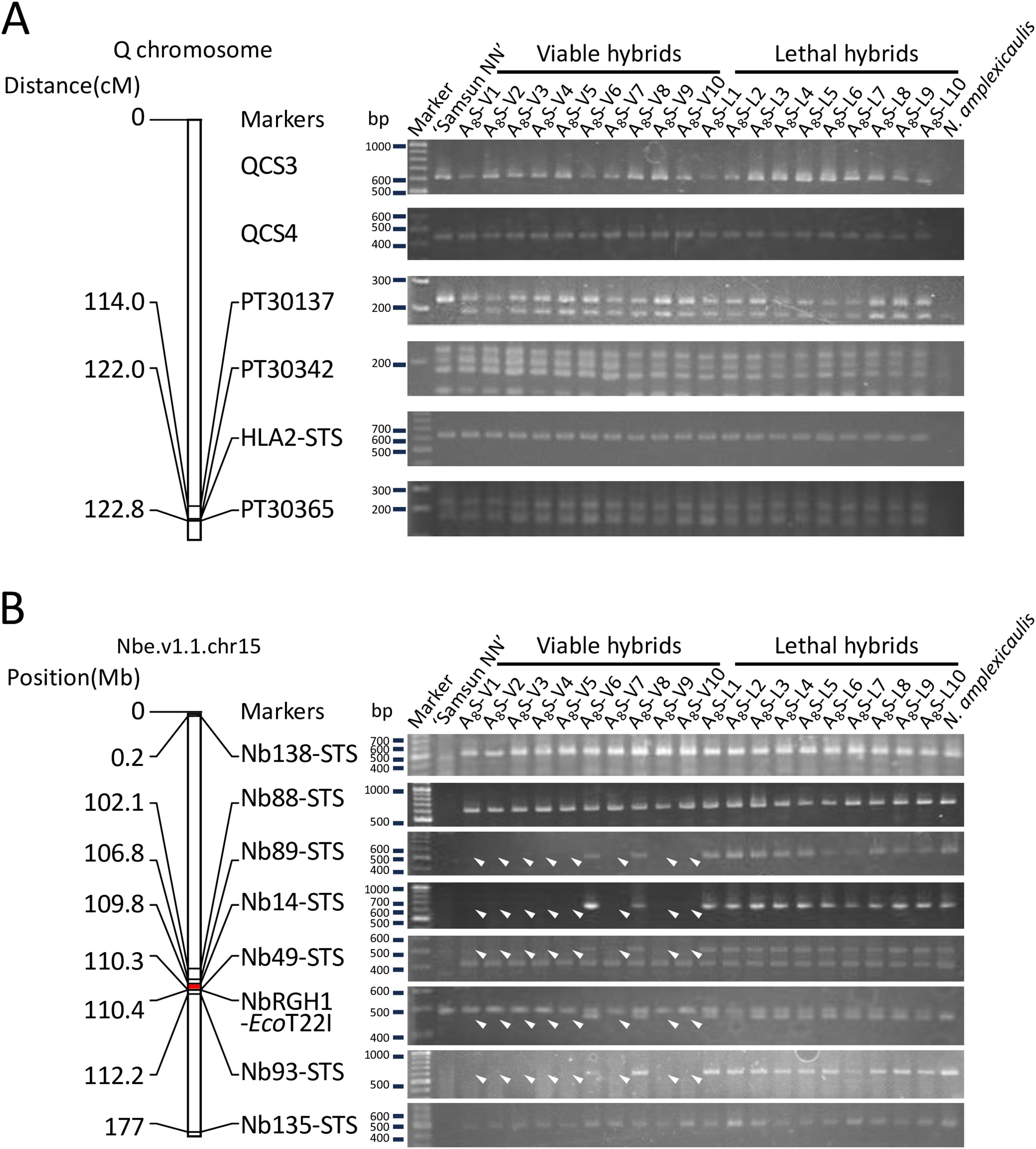 Figure 4. PCR analysis of the two hybrid lethality loci HLA2 (A) and HLA1 (B). (A) Linkage map showing marker positions on the Q chromosome involving HLA2 and the band patterns detected with the markers. (B) Physical map showing marker positions in Nbe.v1.1.chr15 scaffold, which involves HLA1, from the Nbe.v1.1 genome of N. benthamiana, and the band patterns detected with the markers. Position (Mb) indicates the approximate position of the markers in Nbe.v1.1.chr15 scaffold. The Red region indicates the region containing the HLA1 locus. Arrowheads indicate the disappeared bands. Marker lane, size marker (GeneRuler DNA ladder mix).