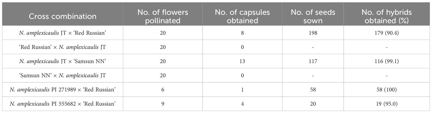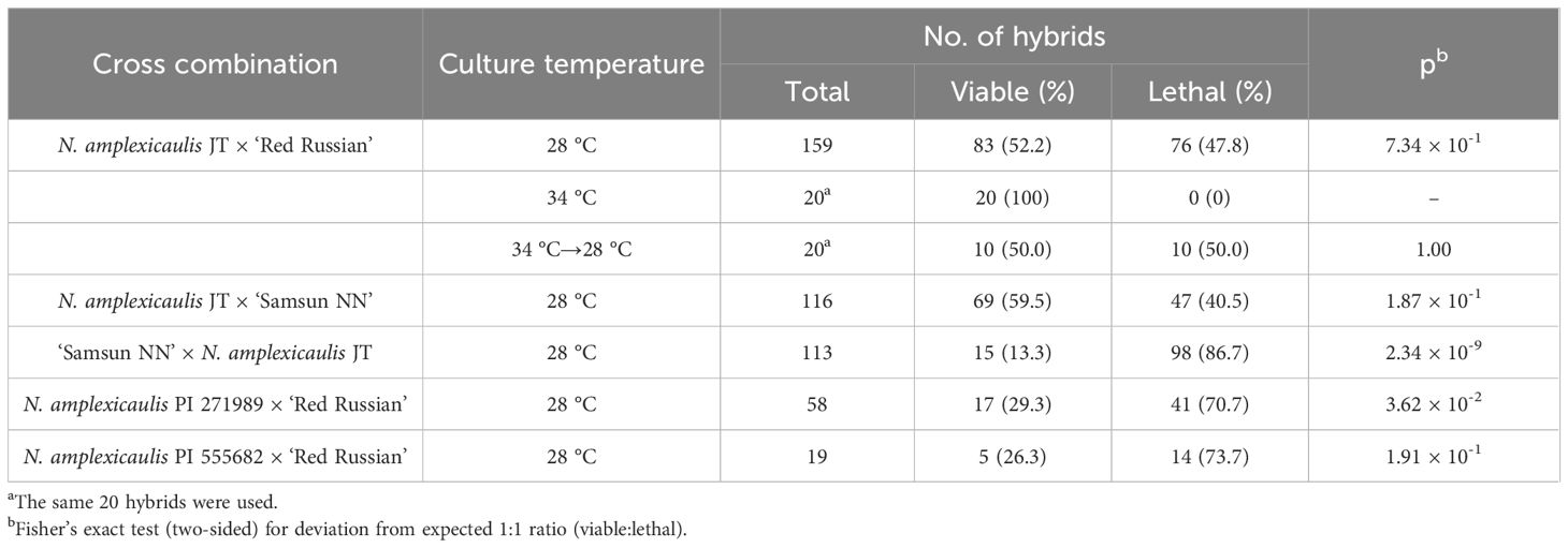 Table 2. Viability of hybrid seedlings between three N. amplexicaulis accessions and N. tabacum at 28 °C or 34 °C.
