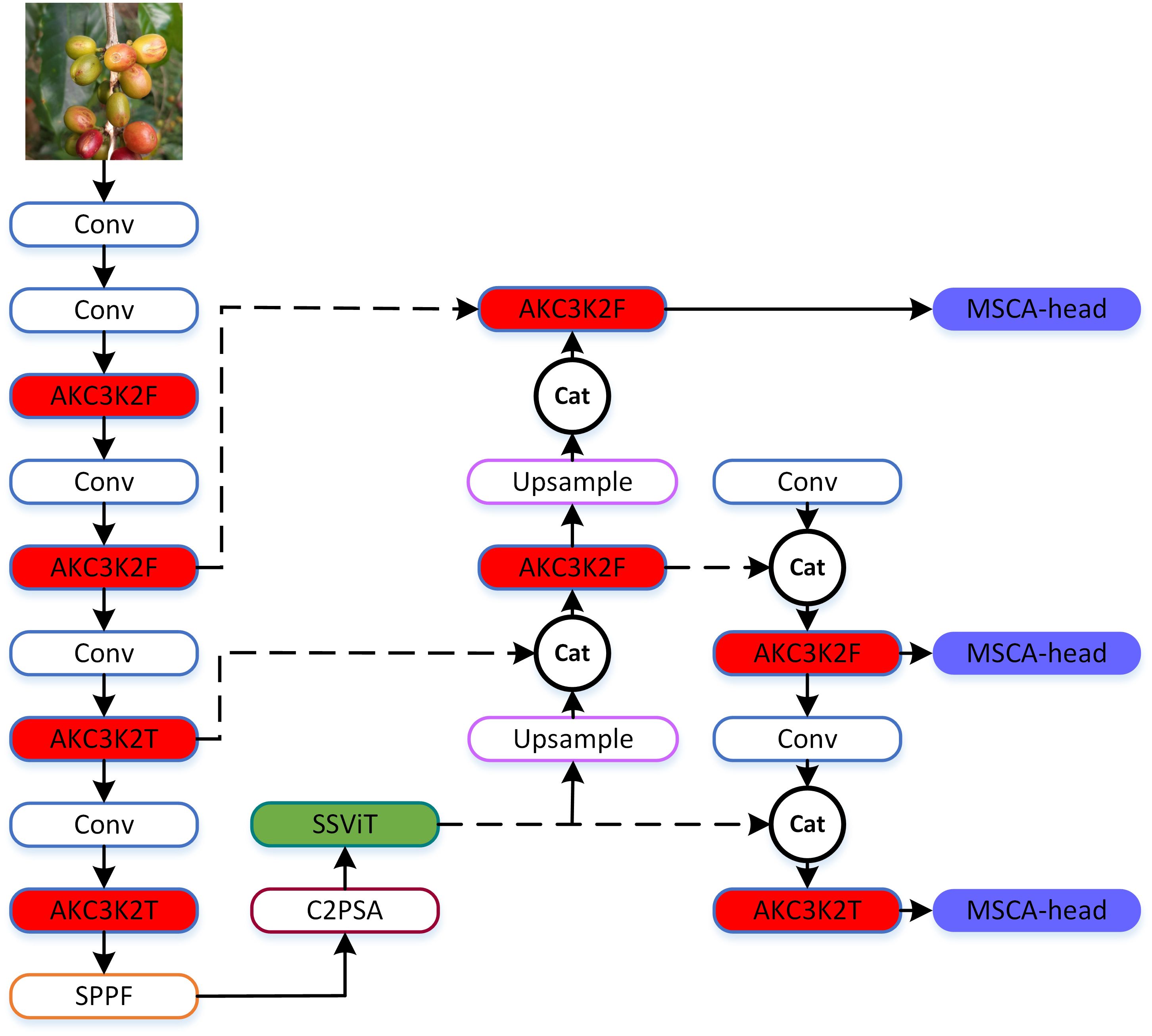 The architecture of SSViT-YOLOv11, which retains the core structure of YOLOv11n while integrating three key lightweight modules: (1) AKC3K2 allows the shape and position of the convolution kernel to be dynamically adjusted according to image content, better matching and covering target regions, and can optimize performance by reducing unnecessary parameters; (2) Single Scale ViT (SSViT) after the deepest feature map to capture global context with minimal computation. This module not only has the advantage of Transformer in global information extraction to improve performance, but also the Single Scale encoder greatly reduces computational complexity, taking into account the real-time detection; and (3) Multi-scale Convolutional Attention (MSCA) in the detection heads to improve multi-scale and occluded object detection. It is a local attention mechanism for multi-scale feature fusion, which can better detect targets of different scales, especially suitable for the situation where coffee fruits are small and grow in clusters. Moreover, the computational complexity is greatly reduced through the combination of strip convolutions. Figure 2 shows the overall architecture of the SSViT-YOLOv11. The three differently colored filled parts in the figure represent the three improved modules proposed in this paper, with their specific details elaborated in Sections 2.3 to 2.5. These modules are strategically placed to address the specific challenges of coffee fruit detection: small targets, occlusion, and embedded deployment constraints.
