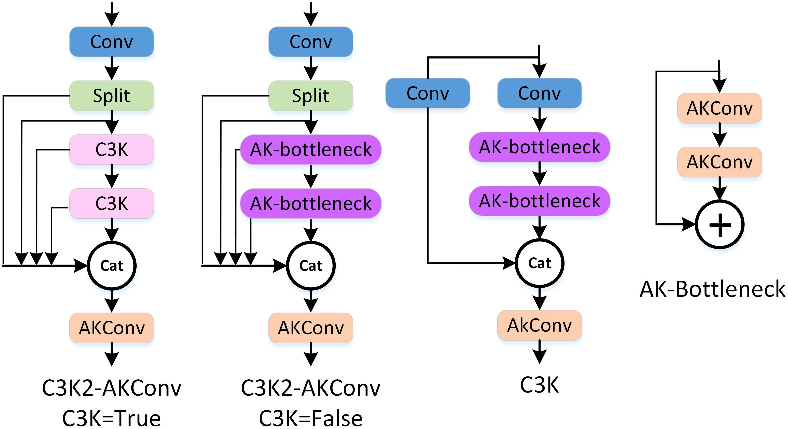In the YOLOv11 architecture, in addition to the standard convolution modules, its unique C3K2 module also contains a large number of convolutions. Therefore, in addition to replacing the standard convolution modules, the C3K2 module is further replaced to improve the lightweight performance of the model. The structures of AKC3K2 are shown in Figure 4.