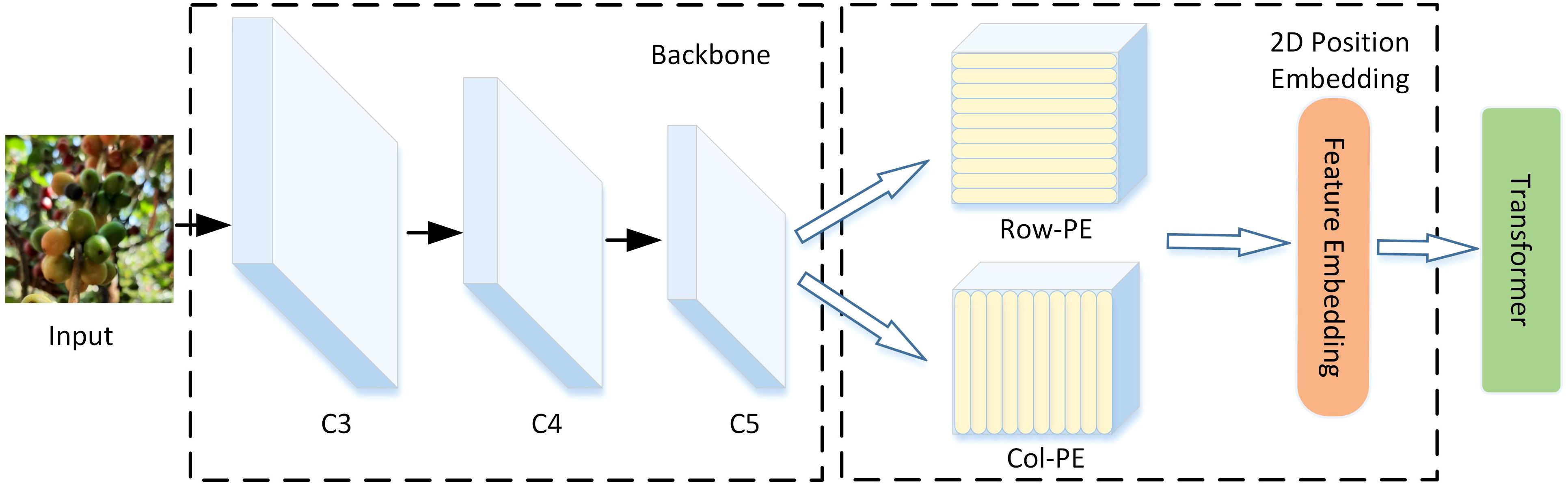 ● The standard 1D sine-cosine Positional Encoding (PE) is extended to 2D row-column PE. This enhances spatial information representation and avoids position confusion caused by the permutation invariance of Transformers (e.g., distinguishing fruits at different positions in the same cluster).