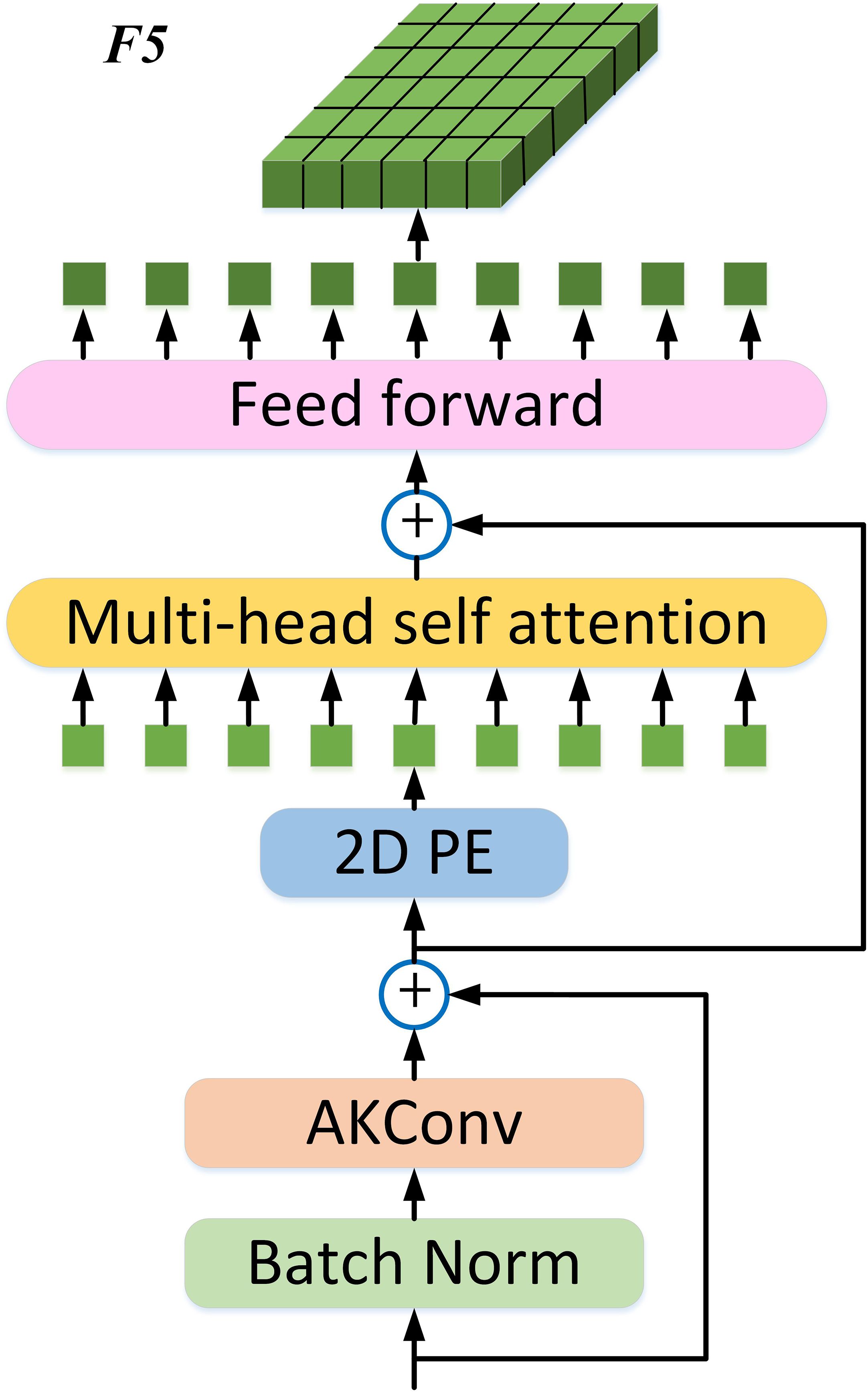 The final feature map C5 obtained from the backbone first connects to BN (batch norm) and AKConv, and then forms a residual connection with C5, further enhancing feature robustness and information integrity. To further improve the real-time performance of the Transformer, after the feature map is processed with 2D PE, a single-scale ViT Encoder (SSVE) is used, which only contains one Encoder layer (Multi-Head Self-Attention + Feed Forward network) to process the output of Q, K, and V at three scales. Note that the three scales share one SSVE, and through this shared operation, the information of the three scales can interact to some extent. This output feature and the input of the 2D PE module complete the residual connection again. Finally, the processing results are concatenated to form a vector, which is then adjusted back to a 2D feature map, denoted as F5. In the neck, C3, C4, and F5 are sent to neck for multi-scale feature fusion. See Figure 6 for details.