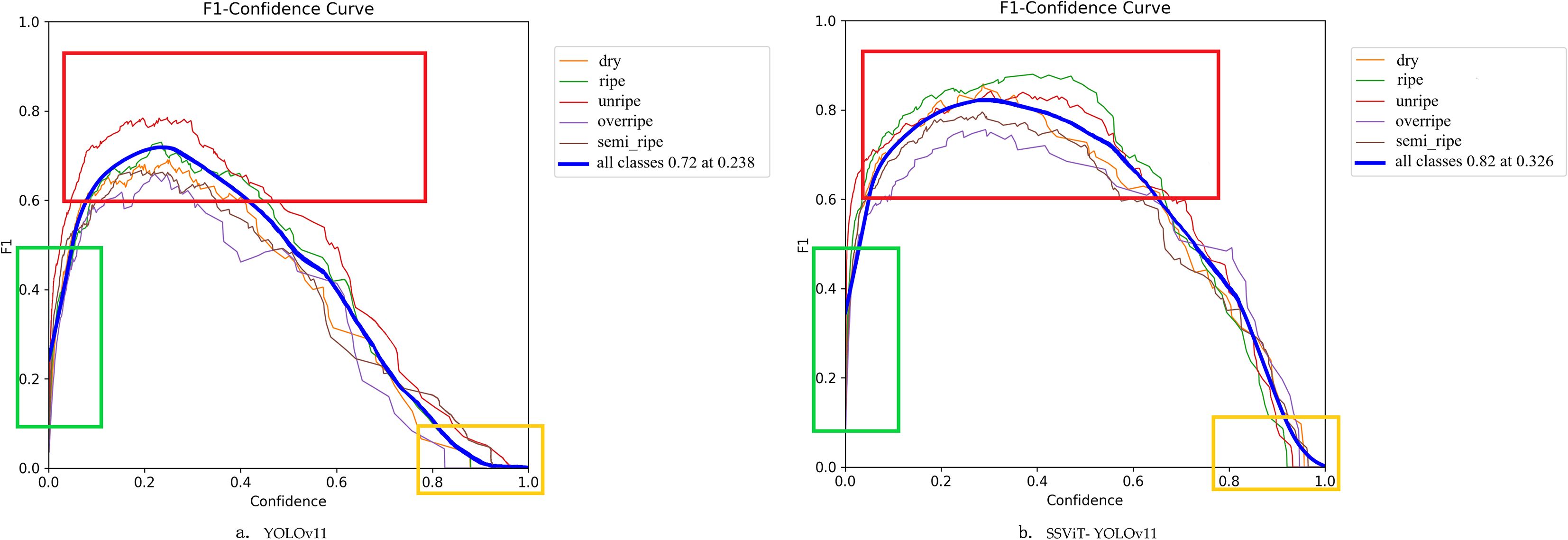 In the green box region (confidence threshold below 0.1), the F1 score of SSViT-YOLOv11 is consistently higher than that of YOLOv11n. This indicates that the model proposed in this paper can more effectively detect small-scale or occluded fruit targets while retaining low-confidence predictions. In the red box region (confidence threshold approximately 0.2–0.8), the F1 score of SSViT-YOLOv11 shows a significant improvement for all categories except for the unripe category, where the F1 score of targets with distinct features remains relatively unchanged. In the yellow box region (confidence threshold > 0.8), the F1 score of the proposed method decreases more slowly. This demonstrates that the model has stronger robustness and the problem of overconfidence in misclassifications is alleviated.