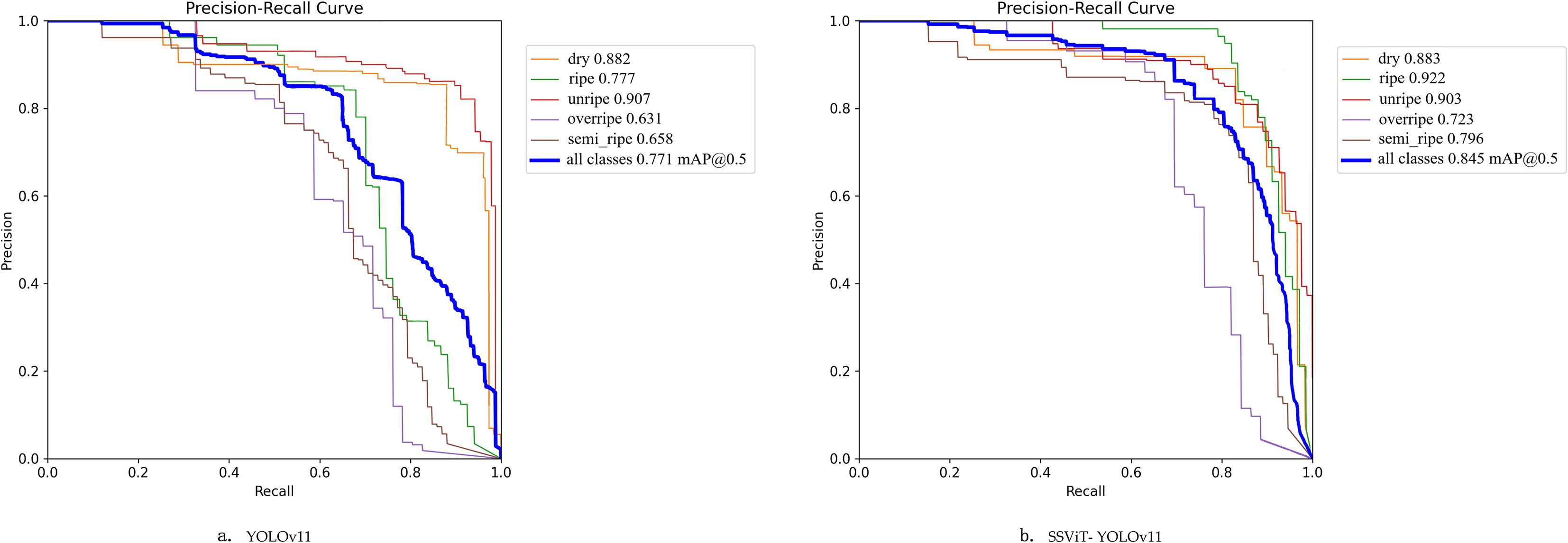Figure 10 presents the Precision–Recall (PR) curves of YOLOv11n and SSViT- YOLOv11. Compared with the YOLOv11n and SSViT-YOLOv11, the AP values for the dry category are 0.882 and 0.883, and for the unripe category are 0.907 and 0.903, which are extremely close. This indicates that there is little difference between the two algorithms in capturing and distinguishing the salient features of these two categories. For the ripe category, the AP values are 0.777 and 0.922, with the most significant increase. The AP values for the overripe and semi-ripe categories also show obvious improvements. This shows that the SSViT-YOLOv11 optimizes the feature extraction and classification mechanism through improved modules, and can more accurately mine the differential features between them and fruits of other maturity stages. It effectively avoids confusion with other categories due to appearance, shape, color and other features. The mAP@0.5 of SSViT-YOLOv11 reaches 0.845, showing a substantial improvement compared to YOLOv11n. From the curve, as the recall rate changes from low to high, the precision decreases more gently. These indicate that SSViT-YOLOv11 model performs better in balancing the precision and comprehensiveness of detecting fruits at different maturity stages, and has superior overall detection performance.