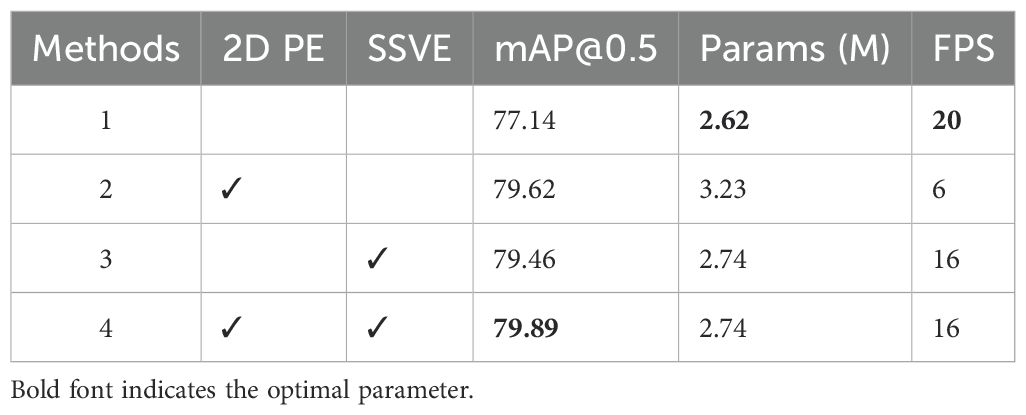 As can be seen in Table 4, on the basis of YOLOv11n, compared by integrating the 2D PE + MSVE module, the accuracy has improved by 2.48%, but the number of parameters has increased by 23.3%, and the FPS has dropped significantly by 70.0%. This is mainly because the traditional ViT includes 12 encoders, which leads to a substantial increase in both parameter count and computational complexity. Although it improves detection accuracy, it has a significant negative impact on real-time outdoor detection. The 3rd and 4th groups of ablation experiments added the 1D PE + SSVE module and 2D PE + SSVE module respectively. The accuracy rates of the two groups of experiments increased by 2.32% and 2.75% respectively, with the parameter counts only increasing by 4.6% and the FPS slightly decreasing by 20.0% in both cases. Explanations: 1. Compared with 1D PE, 2D PE achieves higher detection accuracy, and has almost no impact on both the model parameter count and FPS. 2. The SSVE module achieves a comparable improvement in detection accuracy to the MSVE module, but shows significant improvements in terms of parameter count and FPS. Considering detection accuracy, lightweight performance and real-time capability, 2D PE + SSVE is the optimal improvement scheme.