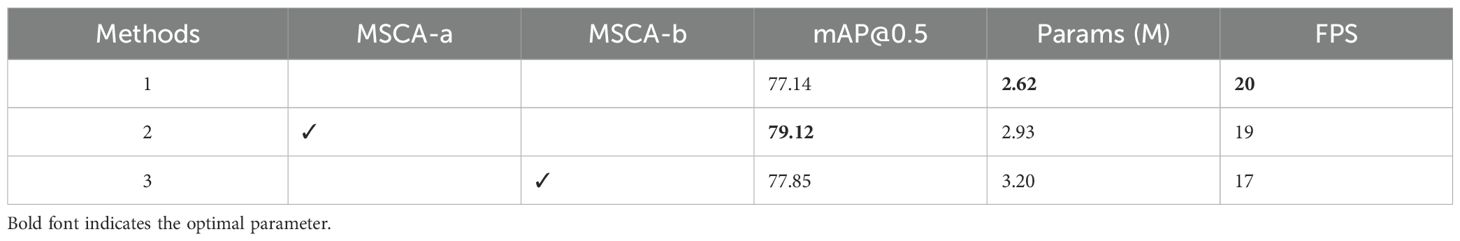 As can be seen from Table 6, after adding the MSCA-a/MSCA-b module, the detection accuracy increased by 1.98%/0.71%, the number of parameters increased by approximately 11.8%/22.1%, and the FPS decreased by 1/3 frames respectively.