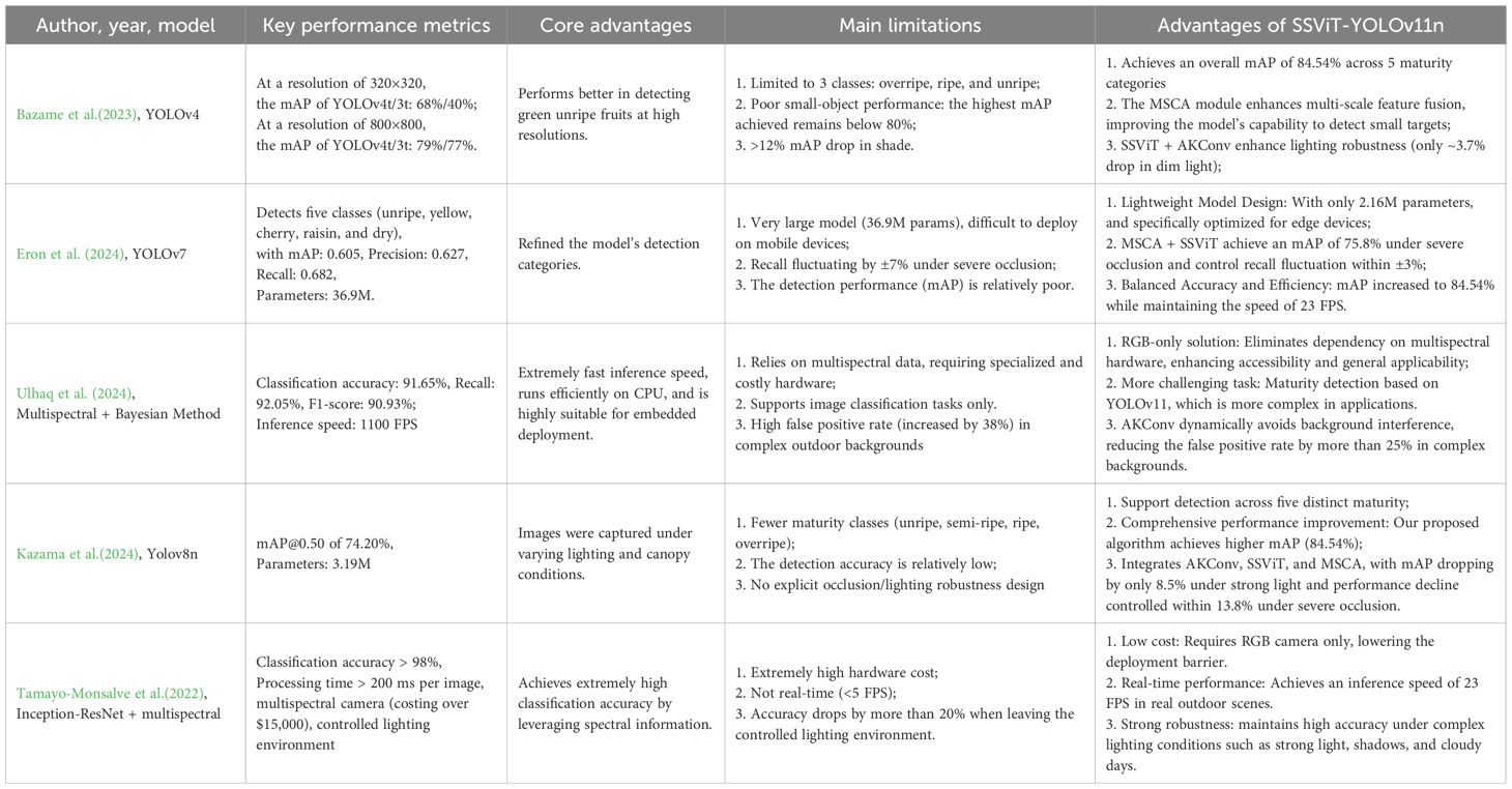 With the rapid development of computer vision and deep learning, image-based object detection technology provides new solutions for agricultural intelligence (Feng et al., 2023; Hussain, 2024; Zhang et al., 2024a, 2022). Among them, the YOLO object detection algorithm has been widely applied due to its real-time performance and versatility. Badeka et al. proposed an improved YOLOv7 algorithm integrated with an attention mechanism to detect the ripeness of grapes. This algorithm was successfully deployed on automated detection robots, effectively improving detection efficiency and accuracy (Badeka et al., 2023). Francisco Oliveira et al. proposed an improved YOLOv7 of node detection in grapevines, achieving F1-Score values between 70% and 86.5% with inference times of around 89 ms for an input size of 1280×1280 px (Oliveira et al., 2024). Chen et al. proposed an improved multi-task deep convolutional neural network (DCNN) based on YOLOv7 in detection of fruit and fruit-cluster ripeness. The method achieved an overall score of 86.6% in mAP, with an average inference time of 4.9 ms (Chen et al., 2024). Zuo et al. proposed an improved YOLOv8 named LBDC-YOLO (Lightweight Broccoli Detection in Complex Environment-YOLO), incorporated the Slim-neck design paradigm based on GSConv and Triplet Attention in the backbone. Experimental results demonstrate the method achieved an average detection accuracy of 94.44% for broccoli (Zuo et al., 2024). Zhang et al. proposed an improved YOLOv7-tiny with ELAN_Partial Conv, Content-aware ReAssembly of Features (CARAFE) and Coordinate Attention (CA), the model achieved a mAP@0.5 of 94.3% and a frame rate of 29.7 FPS (Zhang et al., 2024b). Shen et al. proposed YOLOv8 for tomato leaf disease detection. The model integrated depth wise Convolutions and SE_Block, achieved precision 85.7%, recall 72.8%, and mAP@0.5 79.8%, mAP@0.5:0.95 51.6% (Shen et al., 2025). Zhu et al. proposed a EfficientDet model for the fruit maturity detection of multi-cultivar olives in orchard environments. The CBAM and Bi-FPN are embedded into the model, achieved more than 93% mAP for the maturity detection of four olive cultivars (Zhu et al., 2024). Zhu et al. proposed an improved YOLOv11n for detection and grading of Olive Ripeness, which replaced the backbone with EfficientNet-B0, integrated the LSKA mechanism and the BiFPN. The mean average precision (mAP) of fruit maturity detection reached 94.60%, 95.45%, 93.75%, and 96.05% for 4 olives of cultivar, the mean detection time was 337 ms per image (Zhu et al., 2025). Xiao et al. proposed an improved YOLOv5 for detection of blueberry fruit maturity. The ShuffleNet and CBAM are embedded into the model, the average recall is 92.0%. The mAP@0.5 is 91.5%, the average speed is 67.1 fps (Xiao et al., 2024). Yang et al. proposed GTDR-YOLOv12. The backbone integrated Ghost Conv., Dynamic ReLU and Task-Dependent Attention Mechanisms, achieved precision 88.0%, recall 83.9%, F1-score 85.9%, mAP:0.5 90.0%, GFLOPs 4.8, and the number of parameters 2.23 M (Yang et al., 2025). Covering works that enhance YOLO variants with attention mechanisms, lightweight backbones (e.g., ShuffleNet, EfficientNet), or neck optimizations (e.g., BiFPN, Triplet Attention). We critically note that while these improve accuracy, many still struggle with small-object sensitivity and occlusion robustness, and often increase model size.