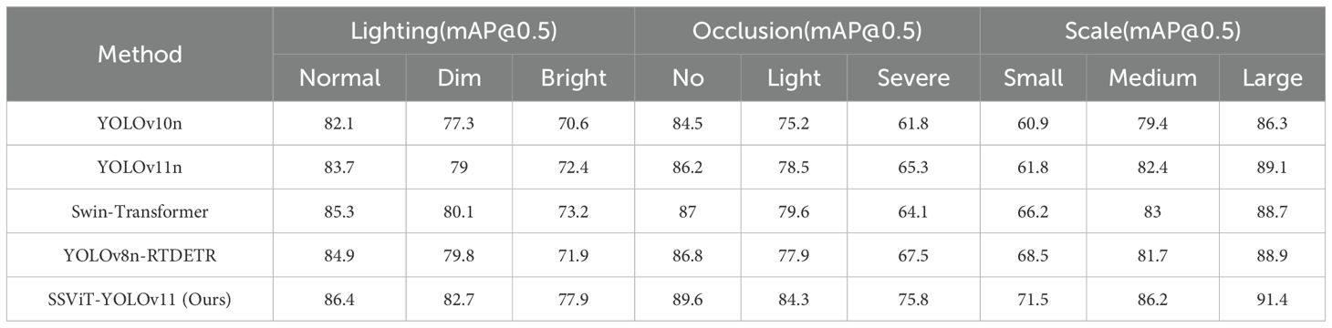 As shown in Table 10, regarding Lighting robustness: All methods exhibit the most significant performance degradation under Bright conditions, as highlight regions cause color distortion that interferes with maturity assessment. SSViT-YOLOv11 achieves the best results across all three lighting conditions, with only a 3.7% drop in mAP@0.5 from Normal to Dim, substantially outperforming other methods (which average a ~5% decline). Occlusion Robustness: Severe occlusion presents the greatest challenge, causing a performance drop of over 19% for all baselines. SSViT-YOLOv11 attains 75.8% mAP@0.5 under severe occlusion, surpassing the second-best method (YOLOv8n-RTDETR) by 8.3 percentage points. Moreover, it shows the smallest performance drop (only 13.8% from no occlusion to severe occlusion), demonstrating exceptional robustness to occlusion. Scale Sensitivity: Detecting small fruits remains a common bottleneck, with all methods achieving their lowest scores in this category. SSViT-YOLOv11 reaches 71.5% mAP@0.5 on small fruits, outperforming the next-best method (RTDETR) by 3.0% and the YOLOv11n by 9.7%. It also maintains leading performance on medium and large fruits. Technical attribution: 1. AKC3K2: Dynamically adjusts convolution sampling points to bypass occluders and highlight regions. 2. SSViT: Leverages global attention to infer the presence and location of occluded fruits and compensates for local illumination distortions. 3. MSCA-Head: Employs multi-scale Conv. to effectively enhance responses for small objects and reduce false detections.