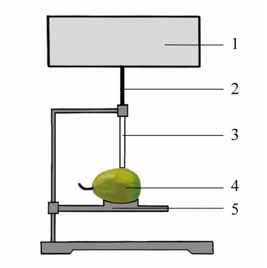Figure 1. Test platform for dielectric parameters of fragrant pear. 1: Vector network analyser 2: Connecting cable 3: Coaxial probe with end opening 4: Fragrant pear 5: Lifting platform.