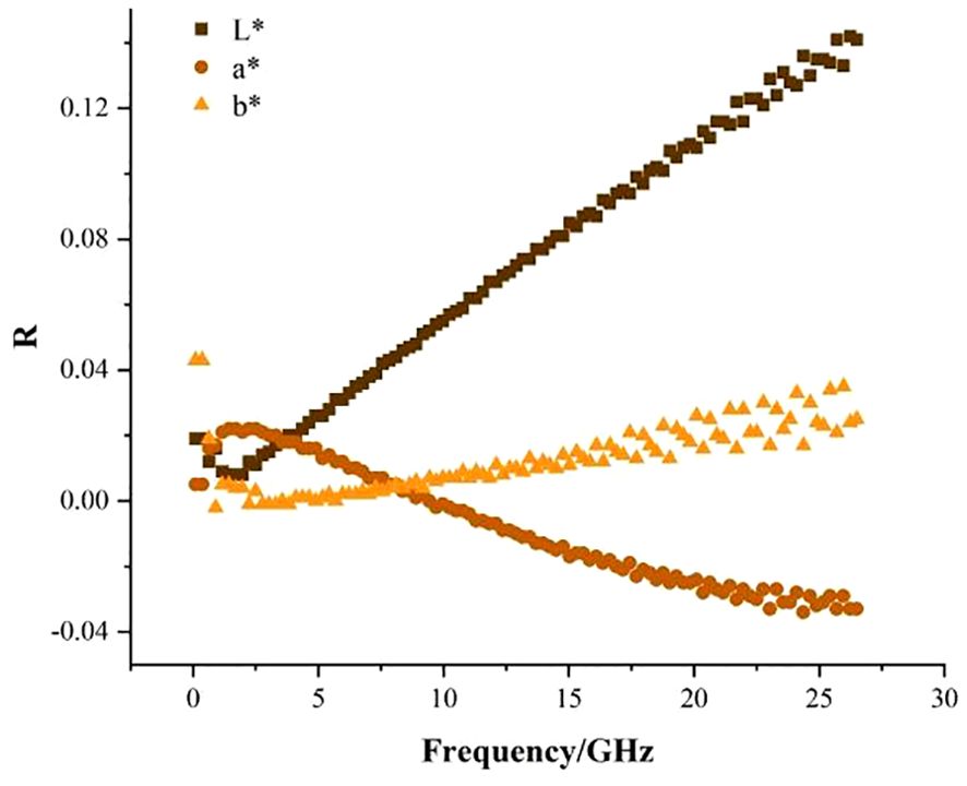 The Pearson correlation analysis between the dielectric constant ϵ’ and colour indexes L*, a*, b* of fragrant pear is conducted first at a single frequency. The linear relationship of ϵ’ and ϵ” with colour indexes at different frequencies is shown in Figures 2, 3. As shown in Figure 2, L*, b*, and ϵ’ are positively correlated, and the value of the correlation coefficient is not more than 0.16. a* and ϵ’ are negatively correlated, and the absolute value of the correlation coefficient is not more than 0.04, indicating that the correlation between ϵ’ and L*, a*, b* is relatively small at a single frequency.