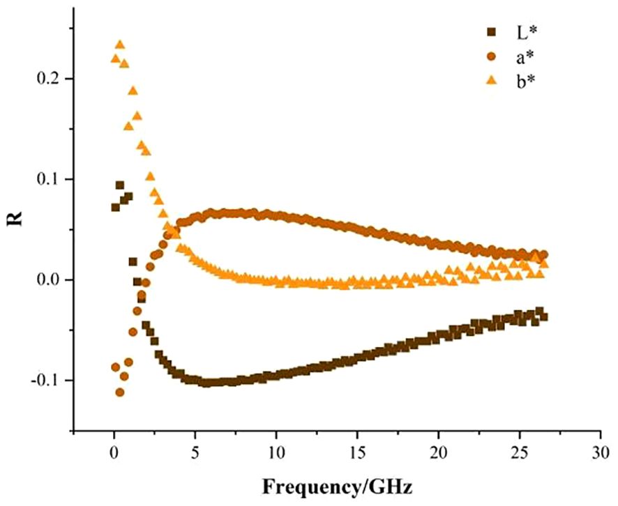 Next, this study analyses the linear relationship between loss factor ϵ’’ and colour indexes L*, a*, b* of fragrant pear at a single frequency. As shown in Figure 3, the correlation between L* and ϵ’’ changed from positive to negative, and the absolute value of the correlation coefficient was not more than 0.03. The correlation between b* and ϵ’’ became weaker, and the correlation between a* and ϵ’’ changed from negative to positive. Therefore, the linear correlation between ϵ’’ and L*, a*, and b* is weak at a single frequency (Guo et al., 2015b). investigated the feasibility of dielectric spectroscopy as a nondestructive technique in determining SSC and firmness of pears during ripening period and found that it is impossible to select one permittivity value at a single frequency for accurate prediction of SSC and firmness of pears. This is consistent with the research conclusion of this study. The reason might be that the spatial information of the fruits obtained at a single frequency is limited (Cao et al., 2024), resulting in a poor correlation between the dielectric parameters and the color indexes.