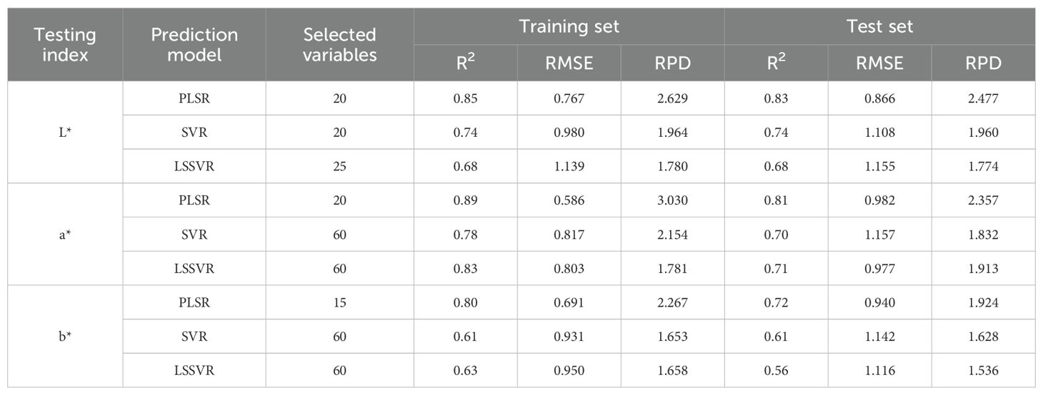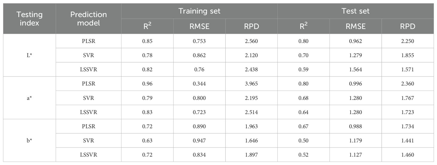 3.2.1 Prediction of colour indexes L*, a*, b* of fragrant pear based on PLSR, SVR, and LSSVR