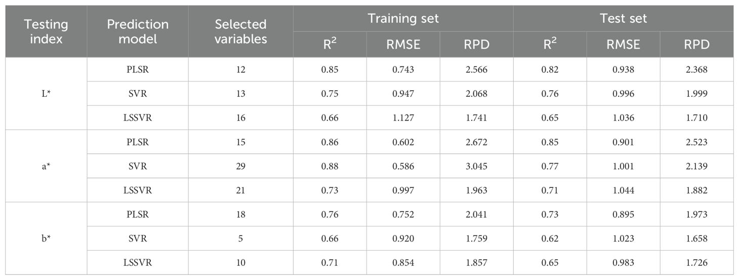 Table 1 presents the results of various models for predicting the color parameters of Korla fragrant pears. The PLSR model performed best in predicting the color parameters L*, a*, and b*, exhibiting the highest R2 and RPD, along with the lowest RMSE. For the prediction of L*, the training set yielded R2, RMSE, and RPD values of 0.85, 0.753, and 2.560, respectively, while the test set produced corresponding values of 0.80, 0.962, and 2.250. For a* prediction, the R2, RMSE, and RPD in the training set were 0.96, 0.344, and 3.965, respectively; in the test set, they were 0.80, 0.996, and 2.360. For b* prediction, the PLSR model achieved R2, RMSE, and RPD values of 0.72, 0.890, and 1.963 in the training set, and 0.67, 0.988, and 1.734 in the test set. Furthermore, compared to the L* and a* parameters, all models demonstrated inferior performance in predicting b*. The average R2, RMSE, and RPD for predicting L*, a*, and b* were only 0.56, 1.098, and 1.545, respectively. This may be due to the extensive redundant information contained within the dielectric spectrum data, which can impair model prediction accuracy (Guo et al., 2015a). Consequently, there remains room for improving the accuracy of PLSR models in predicting the color of Korla fragrant pears; employing feature variable extraction methods could further enhance prediction precision.